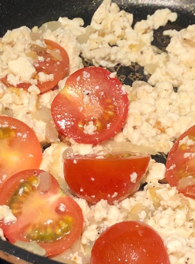 4. 여기에 소금과 후추를 넣어주고 토마토도 같이 넣어 볶아준다.