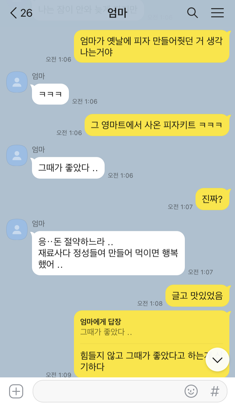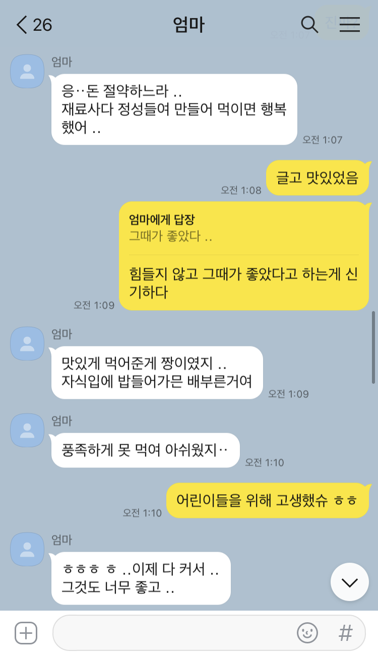 언니들은 각각 노량진과 외고 기숙사에서 수능을 준비했기에 이런 상황을 알지 못했을 거다. 대신 초딩이었던 나와 나보다 더 어린 동생은 이런 과정을 옆에서 지켜봤다. 유독 먹성도 좋고 욕심도 많았던 막내는 이것도, 또 저것도 먹고 싶다는 말을 해맑게 뱉곤 했다. 그럼 나도 눈치를 슬슬 보며 옆에서 거들었다. 그런 애들 앞에서 해줄 수 있는 건 ‘건강을 위해서’라는 핑계뿐이었을 거다. 아니 핑계나 거짓 따위는 아무래도 상관없었을 거다. 당장 전화 한 통이면 눈 앞으로 오는 것들을 뒤로하고 해 줄 수 없었던 마음은 어땠을까.