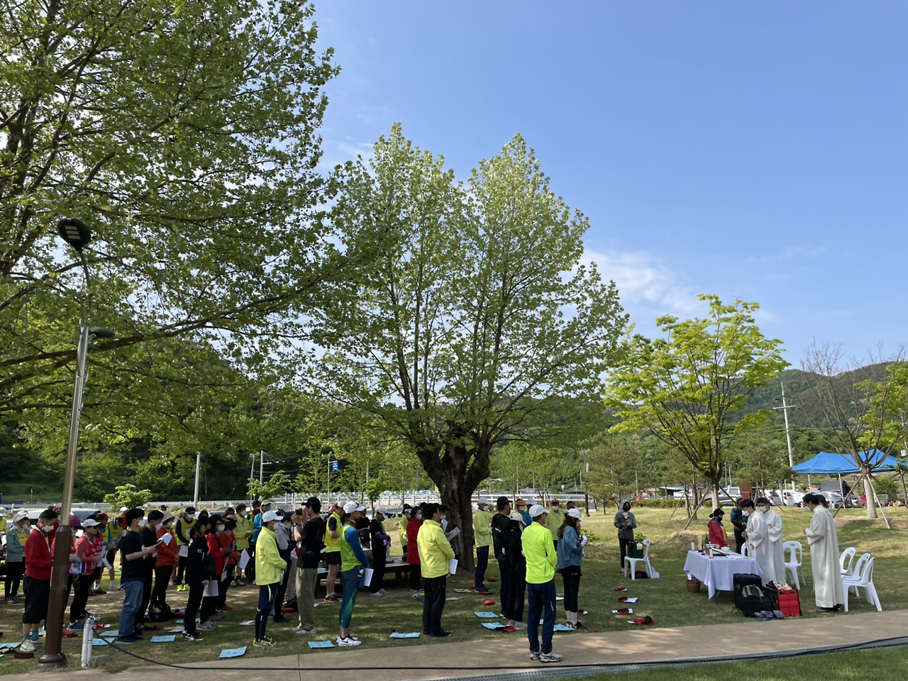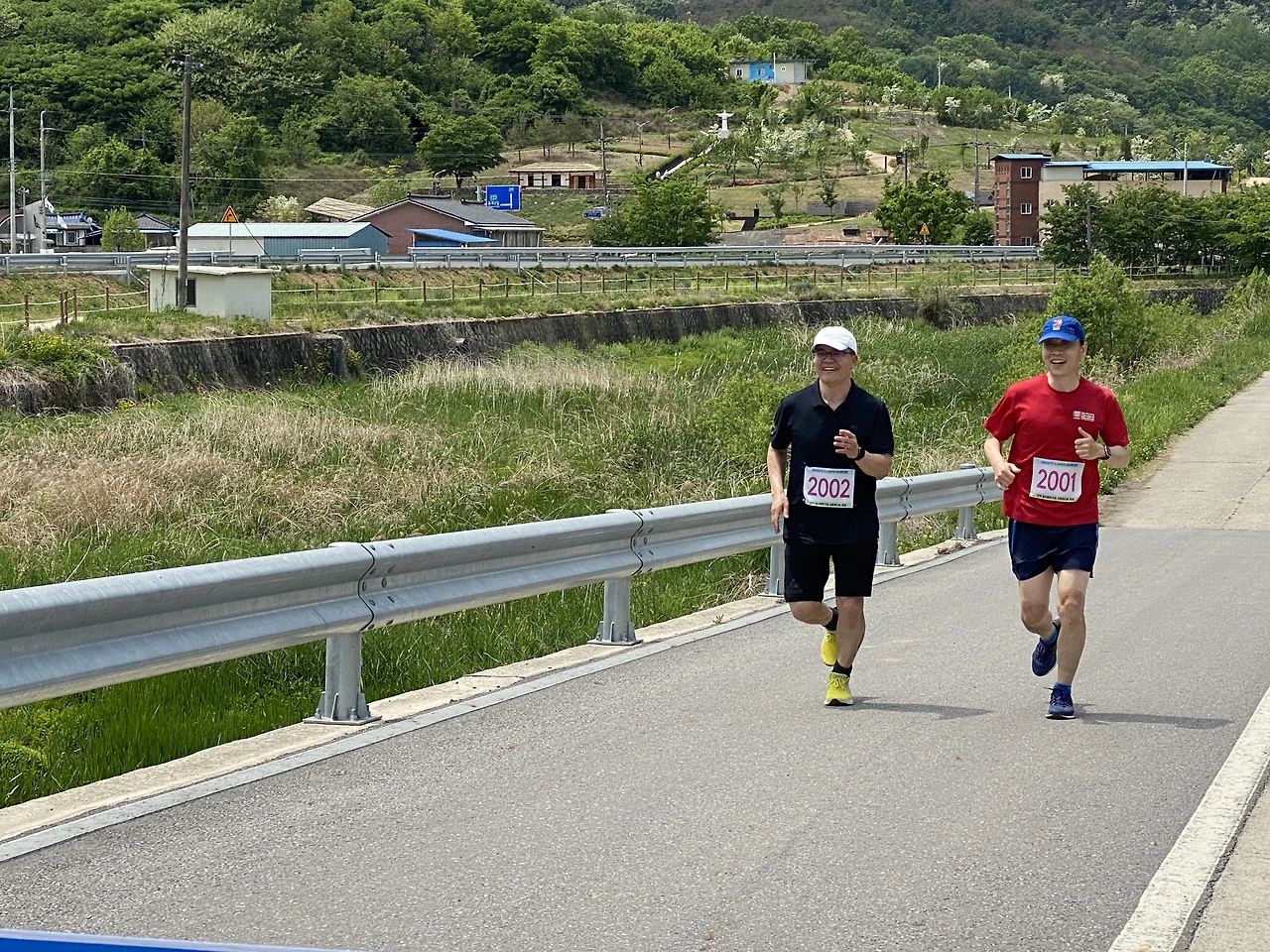 오직 하프마라톤 완주를 목표로 두 신부가 나란히 아침 9시 55분에 출발했다. 그동안 나누지 못했던 이야기를 나누며 군위읍을 거쳐 군위 IC 부근에서 턴을 했다.