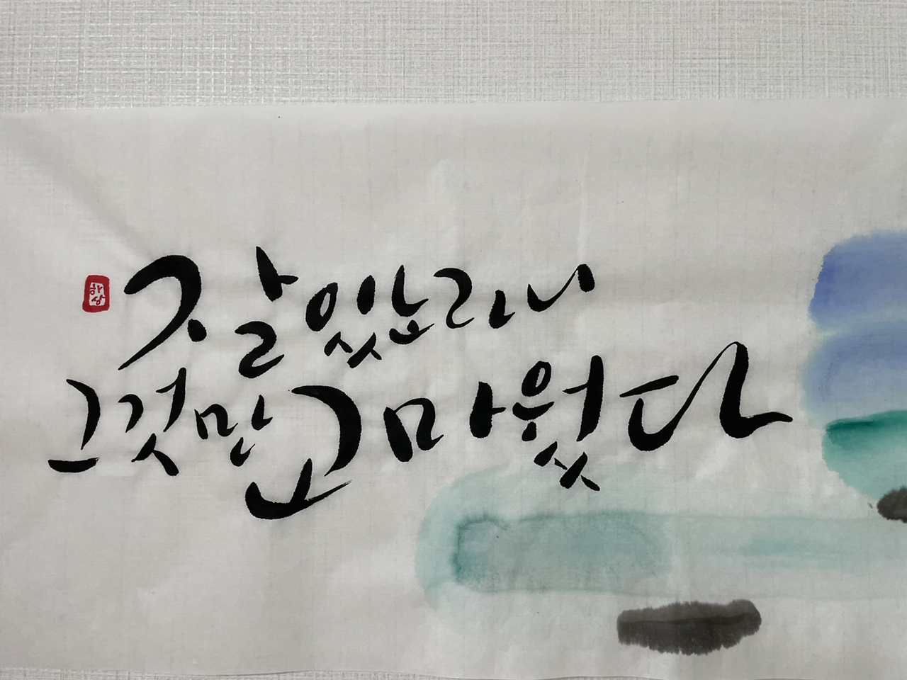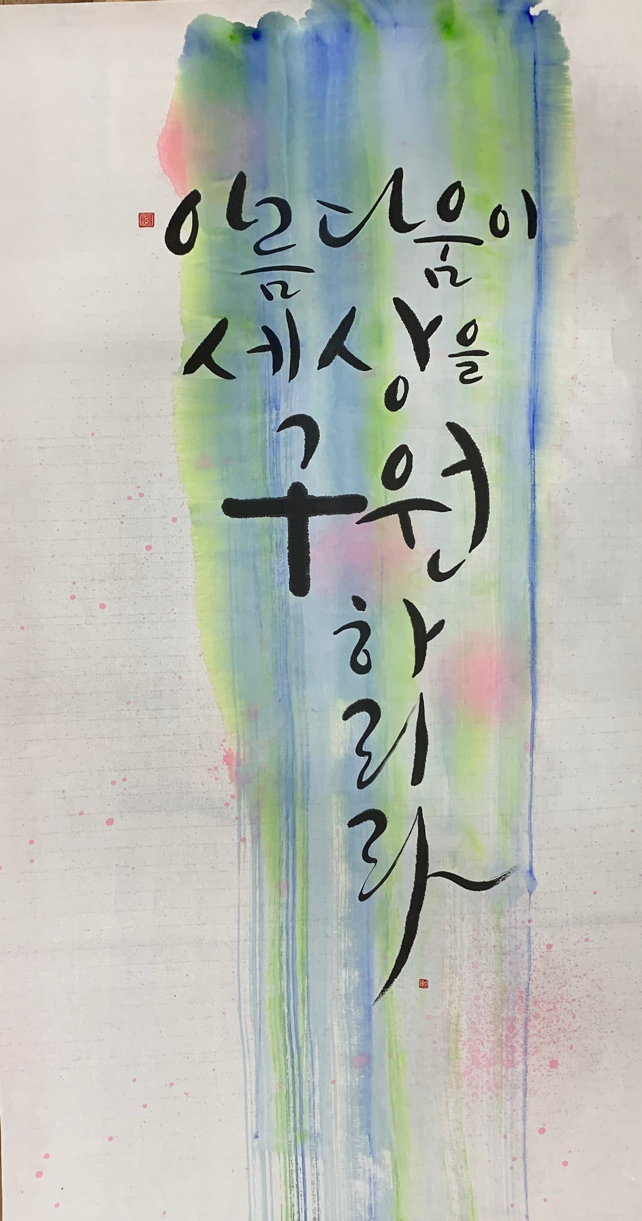 그런 마음으로 아름다움을 캘리에 담아보려 노력했다. 그리고 수녀님의 도움으로 색을 넣어 표현할 수 있게 되어 나의 첫 캘리그라피 작품이 완성되었다. 내 안의 열기에 설레인다.