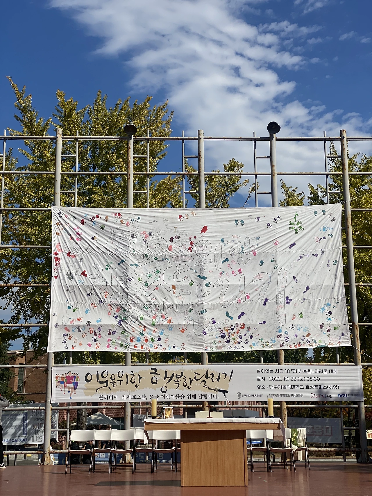 대회 당일 시작 전후로 참가자들이 달리면서 기억할 사람들의 이름을 적고 그 위에 풋/핸드 페인팅을 해서 큰 걸개그림으로 제작한 '이웃을 위한 행복한 달리기'는 살아있는 사람 18의 주제로서 미사내내 바람에 살랑거리며 빛났다.