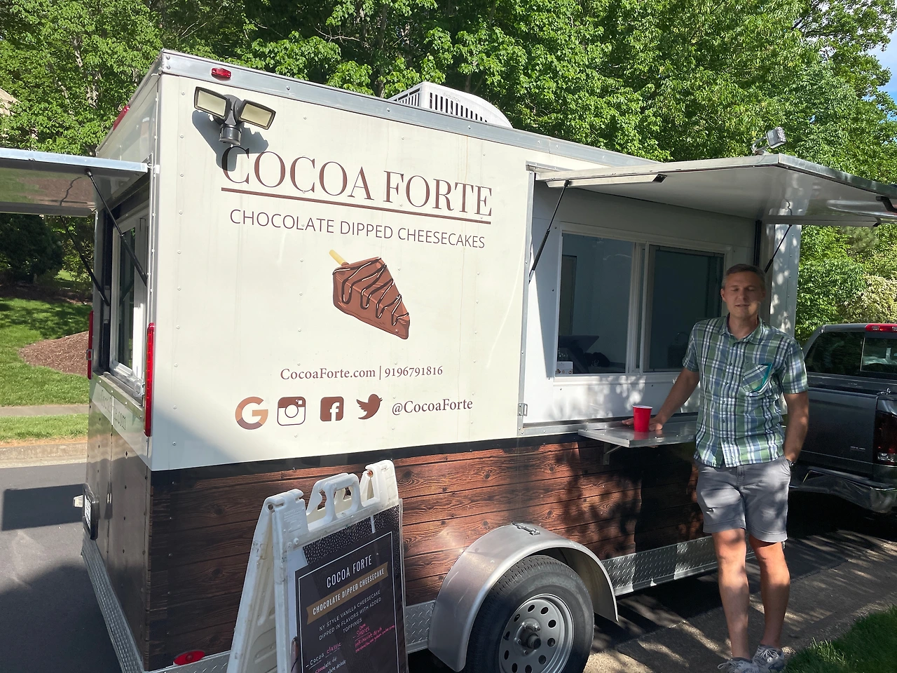 결혼 전날 늦은 오후, 에밀리와 브렌트의 새 보금자리 차고 앞에 앉아 신랑이 담근 수제맥주를 마시며 푸드 트럭으로 온 치즈 케익을 디저트로 먹는다.