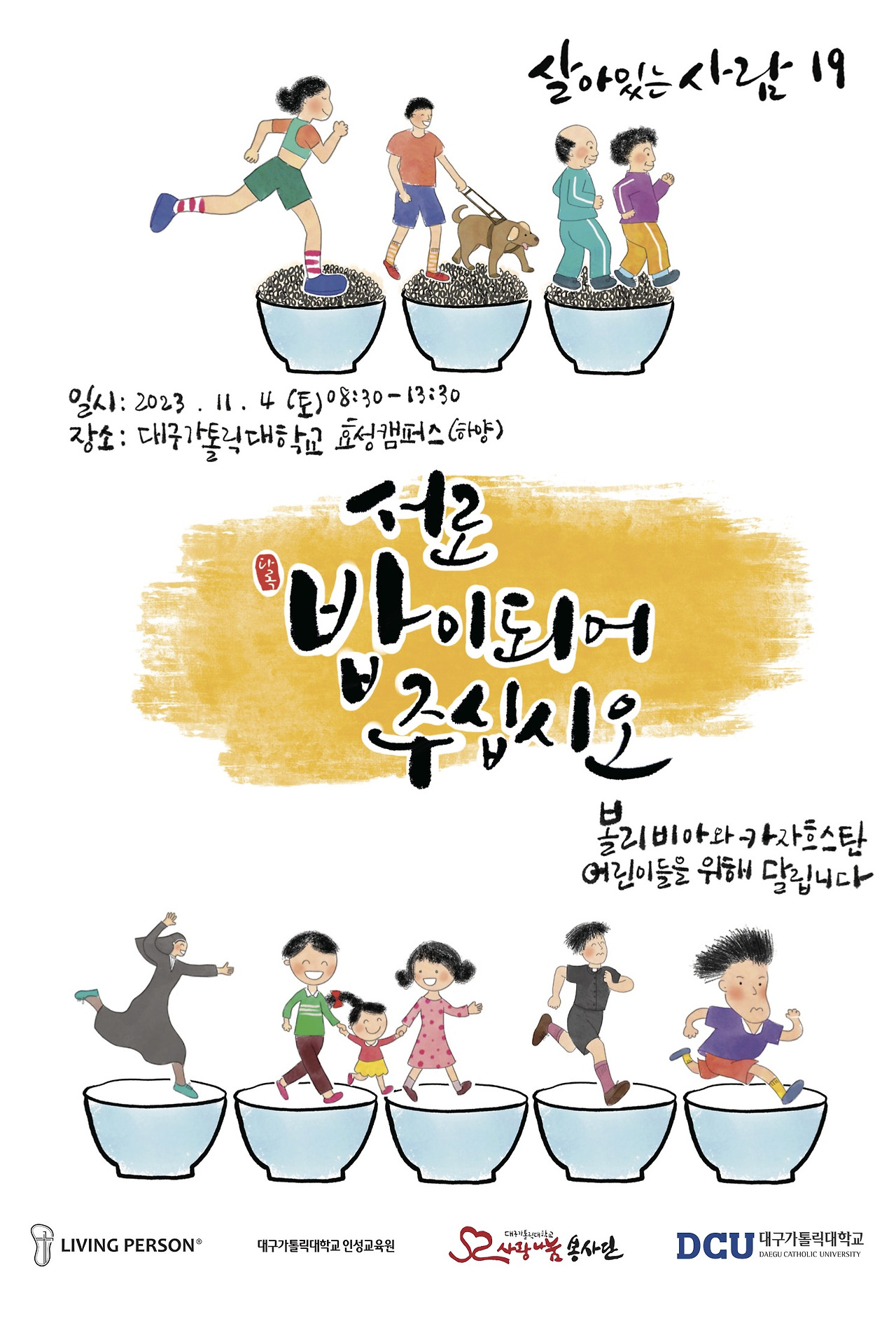 십구년째를 맞이하는 '살아있는 사람 19'는 김수환 추기경님의 말씀 "서로 밥이 되어 주십시오"를 주제로 11월 4일 토요일 대구가톨릭대학교 효성캠퍼스(하양)에서 열릴 계획입니다.