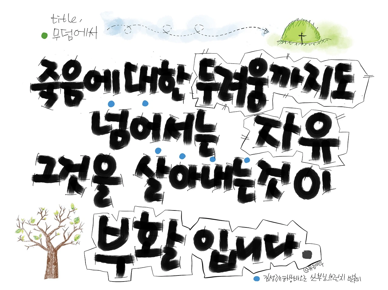 그리고 이것은 나이가 들수록 나아지지 않습니다. 오히려 죽음은 점점 더 가까이, 더 오래 머뭅니다. 지난해 유월, 아버지 장례를 치르면서 두번째 치르는 부모님 장례가 결코 익숙해질 수 없음을, 오히려 더 힘들고 고통스러웠다는 것은 우리가 살아내야 할 진리입니다.