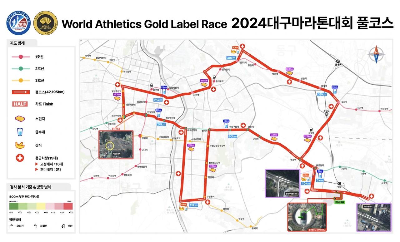 그동안 '골드 라벨(Gold Label)' 대회 수준에 맞는 풀코스가 없었는데 올해는 대구스타디움에서 시작해 달구벌대로를 따라 뛰다가 서문시장을 기점으로 돌아 대구역, 동대구역, 아양교를 건너 지하철 1호선을 따라 가다가 율하역에서 우회전하여 범안대교를 건너 돌아오는 풀코스가 생겼다.