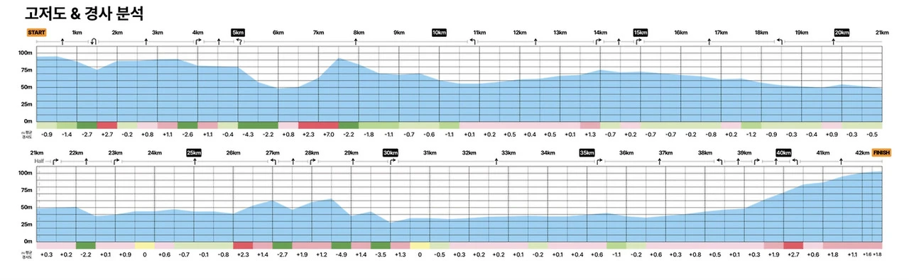 또 풀코스 마지막 3킬로, 곧 39킬로지점부터 시작되는 오르막이 말도 안 되게 길었다. 가장 힘든 시기에 가장 어려운 코스를 만들어 두었으니 분명 러너들은 그 지점을 지나며 다들 쌍욕(?)을 했을 것 같다.