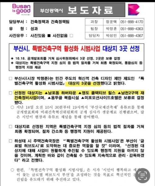 오늘 부산시 특별건축구역 활성화 시범 사업에 삼익비치도 선정됐다.