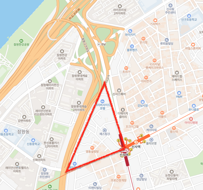 모든 상권이 위 공식을 따라 형성되는 건 아니지만, 이렇게 아파트 입지와 재건축, 고급주거지 형성조건을 공부하다 보면, 미래 호재와 사람들이 모일 곳에 대해 자연스럽게 파악이 된다. 그런데 미래 호재를 보고 너무 빨리 들어가는 투자는 항상 리스크가 있다. 여윳돈으로 하거나 자기 사옥을 지어서 기다릴 수 있는, 오랜 기간 동안 버틸 수 있는 사람이 해야 한다. 그래서 먼 미래 호재를 보고 빌딩에 장기 투자하려면 싸게 사는 게 무엇보다 중요하다. 아래 예시를 참고해서 생각해 보자.
