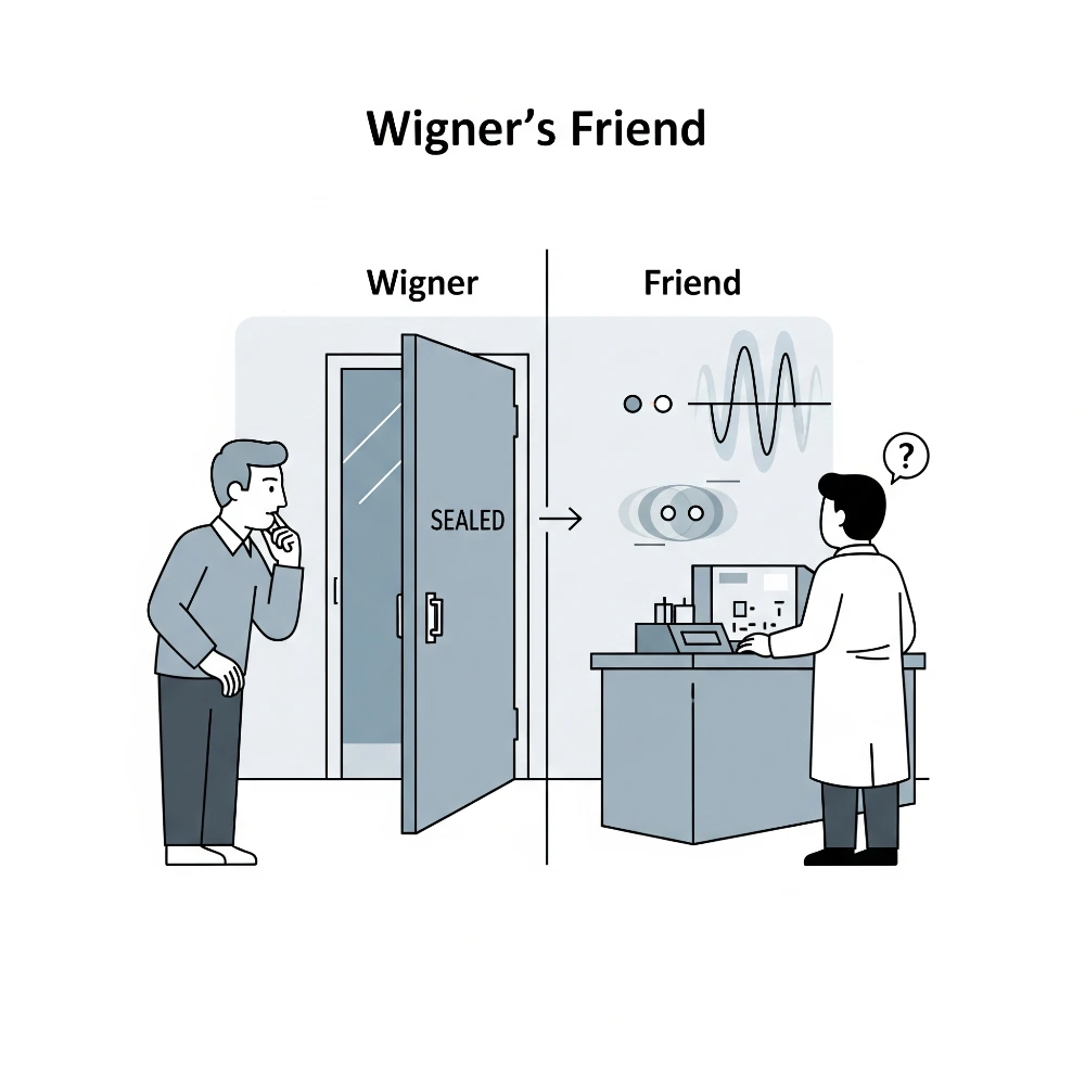하지만 여기서 위그너의 관점에서 보면 상황이 다릅니다. 위그너는 실험실 밖에 있으면서 친구와 입자를 포함한 전체 시스템을 '하나의 큰 양자 상태'로 봅니다. 위그너의 관점에서 보면, 친구가 측정을 마친 후에도 친구와 입자의 상태는 여전히 중첩되어 있습니다. 즉, 친구는 '스핀 상인 입자를 측정한 친구'와 '스핀 하인 입자를 측정한 친구'가 중첩된 상태로 존재하는 것이죠. 위그너가 실험실 문을 열고 친구에게 결과를 물어봐야 비로소 시스템 전체가 붕괴하여 하나의 결과로 확정됩니다.