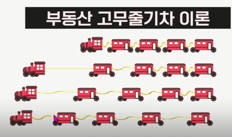 한국 부동산 시장의 순환 움직임을 가장 잘 설명하는 비유는 단연 '고무줄 기차 이론'이라고 생각합니다.