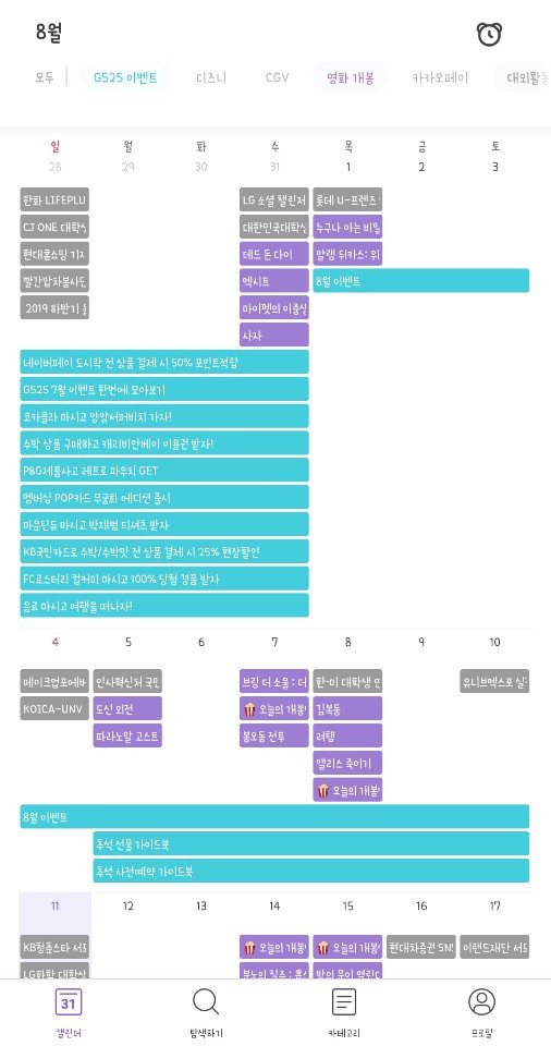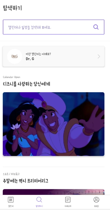 두 번째가 탐색하기 탭이다. 탐색하기 탭에는 주제를 불문하고 다양한 콘텐츠들이 모아진다. 사용자들이 첫 번째 탭에서 ‘정적인’ 캘린더를 본다면, 두 번째 탭에서는 나름대로 ‘동적인’ 느낌을 받을 수 있다. 누군가 친근한 말투로 제작한 콘텐츠들이 모아져 있는 공간이니까. 무엇보다 앱에서 두 번째 탭으로 자리 잡고 있다는 것은, 탐색하기가 앱 내에서 꽤 중요한 역할을 하고 있음을 알 수 있다.