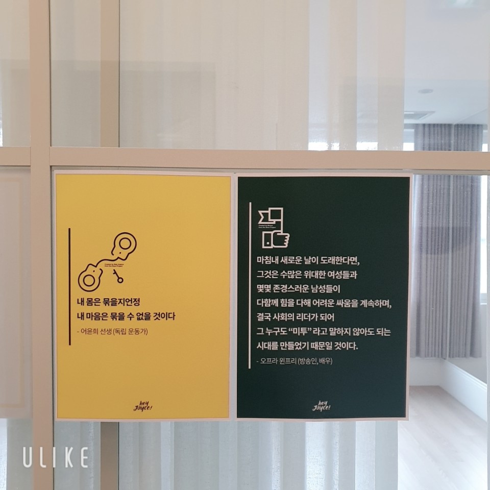 어느 정도 아지트 투어를 끝내고, 여자 직원들끼리 한 공간에 모였다. 나는 이번이 첫 회사 생활이기 때문에 경험이라고 할 만한 일들이 거의 없지만, 경험이 많으신 다른 분들의 이런저런 이야기를 들으며 같은 여자로서 공감도 하고 분노도 하는 시간을 가졌다. 불과 몇 년 전까지만 해도 쉽게 거론되지도 못했던 사건들이 이제는 조금씩 수면 위로 드러나고 있는 것을 보면, 세상에 아주 조금씩은 변화가 오고 있는 것 같다.