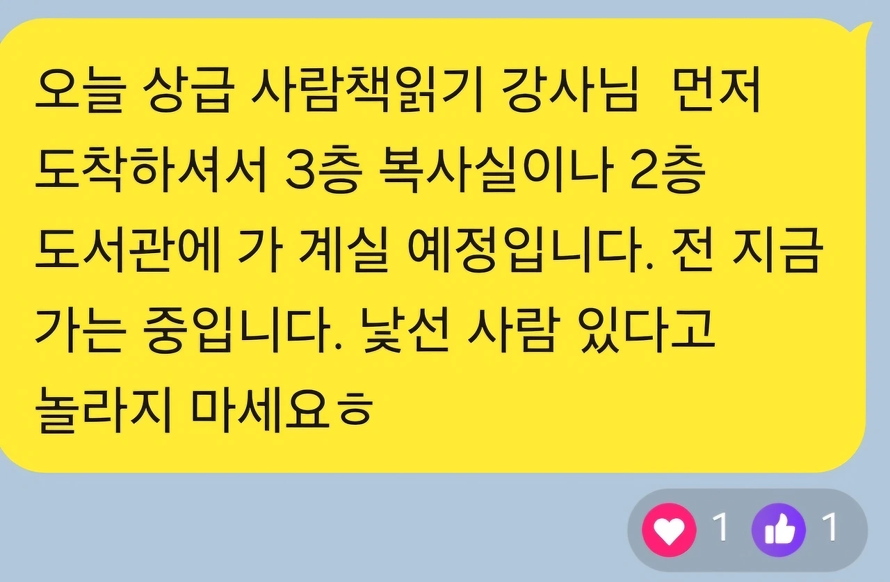 "올라가자. 강사님 일찍 오셔서 강의 시작 시간을 20분 당기신다며."
