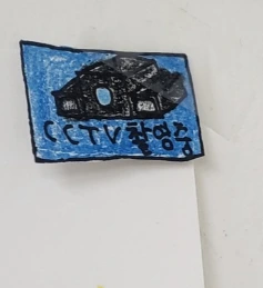 결국 상징적인 그림을 하나 그리기로 했고 그려서 오렸다. 그런데 이번엔 그 오린 그림을 놓는 위치로 실랑이가 벌어졌다. 그 상징적인 그림은 바로 CCTV 촬영 중이라는 그림이었다. 제 딴엔 아주 기발한 그림이라고 생각했을 것이다. 그래서 모둠친구들이 간판 한쪽 위가 적당한 위치라 여겨져 그림을 그곳에 붙였는데,