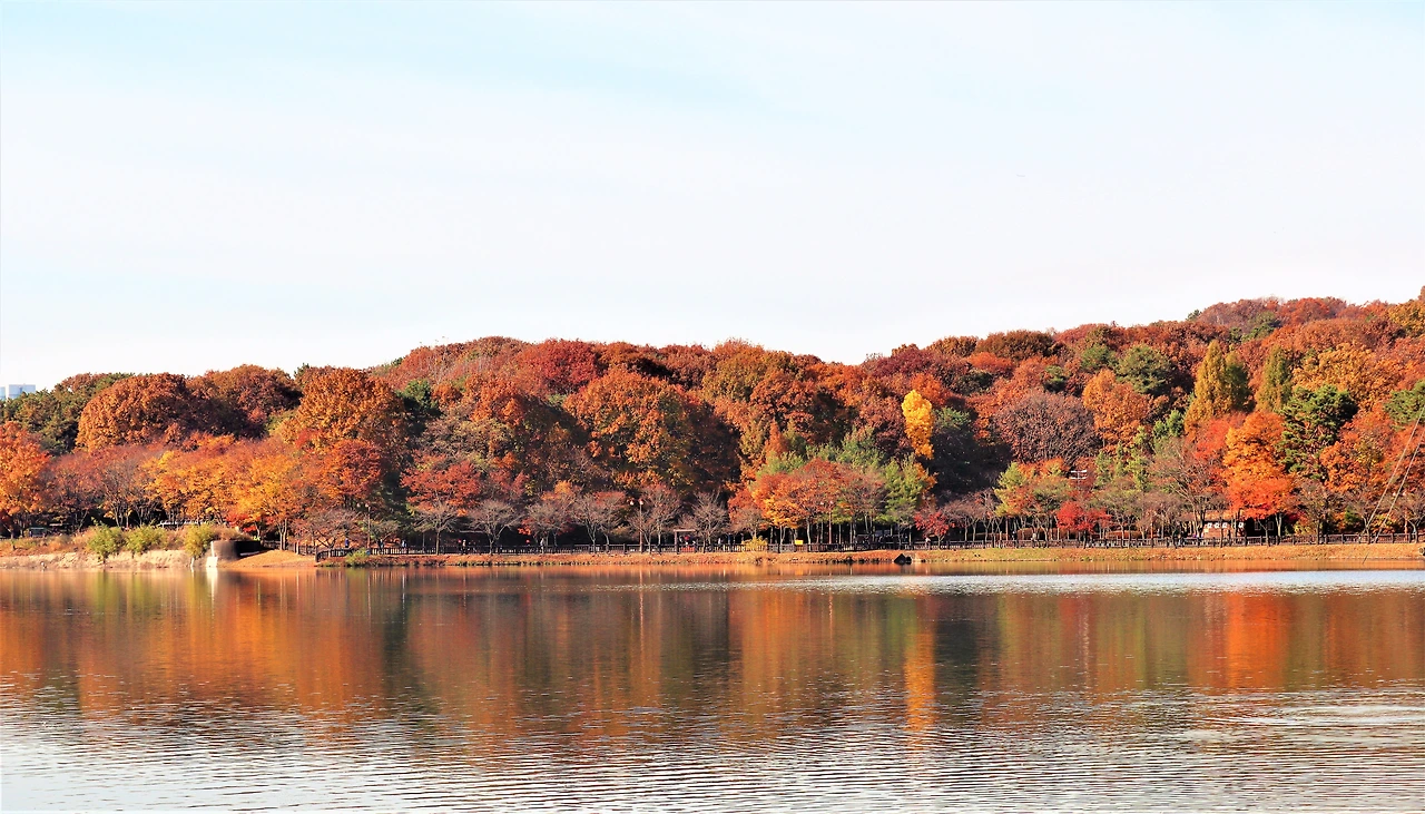 율동공원 입구 쪽을 바라보고 찍은 가을 풍경이다. 이 단풍과 더불어 2021년의 가을도 저물 것 같다. 멀리 분당 요한 성당의 첨탑, 그리고 그 뒤에 지역난방 발전소의 굴뚝이 보인다. 율동 공원은 성남시가 1999년 8월 30일에 원래 있던 분당저수지를 중심으로 완공한 것으로 분당저수지 주변으로 2.5km의 산책로와 자전거도로가 개설되어 있다. 그밖에 다양한 시설이 있다. 2000년 초반 만해도 일산의 호수공원과 더불어 신도시의 멋을 대표하는 장소였으나 이제는 많은 도시에 비슷한 공원이 마련되어 독보적인 수준은 아닌 것이 되었다. 그런데도 여전히 아름답고 많은 사람이 찾는 명소이다. 주차장이 워낙 넓어서 주차 문제는 겪은 적이 거의 없다.