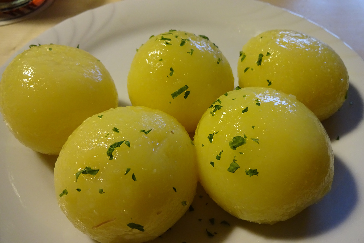 다음으로 찰진 감자 덩어리 만드는 방법이다. 감자를 삶아서 껍질을 벗긴 다음 오븐에 잠깐 굽는다. 이는 수분을 제거하기 위한 것이다. 감자가 팍팍해져야 한다. 그러고 나서 감자를 충분히 으깨야한다. 으깬 감자에 계란 노른자와 감자 전분과 버터를 차례로 섞어 잘 반죽한다. 반죽이 매끄럽게 되고 나면 적당한 크기의 공 모양을 만든다. 한 사람당 2개 정도의 분량을 준비하여 소금 간이 된 끓는 물에 넣고 15분 정도 삶는다. 참고로 이 감자 덩어리는 너무 찰지면 안 된다. 독일 사람들은 쫄깃한 음식을 먹을 줄 모른다. 한국의 떡을 나누어 준 적이 있는데 매우 고통스러워했다. 삼키는 시점을 찾을 길이 없어서 마냥 씹고만 있었다. 독일 사람이 생각하는 찰진 것과 한국 사람이 생각하는 쫄깃한 것은 차원이 다른 개념이다.