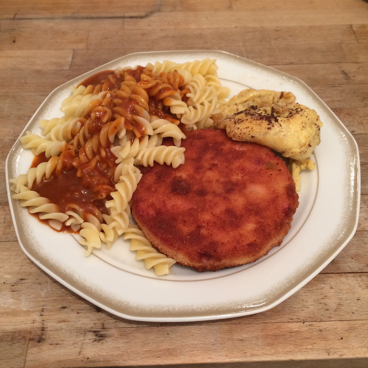 파스타와 버섯소스를 곁들인 예거슈니첼