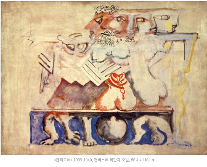그의 초기 작업들 사이를 거닐다가, 작품 〈안티고네〉 앞에 발걸음을 멈췄다. 강렬한 색도, 선명한 형상도 없었다. 그러나 그 낯선 화면 앞에 선 순간, 마음은 이상할 만큼 복잡해졌다. 겹쳐진 얼굴들과 어긋난 신체, 뒤틀린 선들 속에서 그녀의 두려움과 고통, 신념이 동시에 읽혔다. 화면 아래쪽엔 기묘한 동물의 다리처럼 보이는 형상이 있었고, 누군가는 그것을 ‘제단’이라 불렀다. 로스코는 안티고네를 고대의 비극을 넘어 인간 내면의 고통과 말 없는 저항의 상징으로 해석했다. 고통과 희생이라는 보편적 감정을 자신의 언어로 새롭게 태어나게 했다. 그림 속 안티고네는 침묵하지만, 겹쳐진 얼굴과 어긋난 몸, 짓눌린 화면은 언어보다 깊이 그녀의 내면을 전달한다.