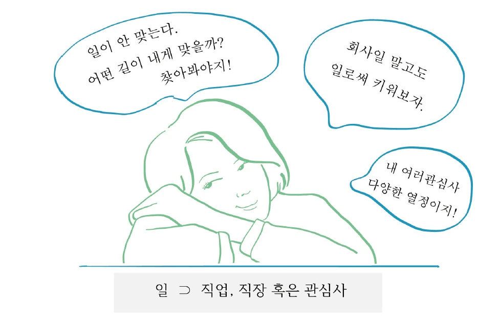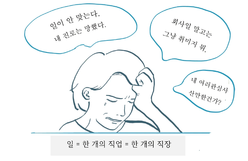 ‘일은 한 개이며, 다니는 직장에 국한되며, 생계를 꾸리는 주 수단이며, 사회적 인정을 받는 것’이라는 좁은 정의는 다양한 열정과 재능의 숨을 죽인다. 직업/직장이 되지 않은 것들은 ‘내 정체성’이기 보단 ‘별거 아닌 것’이 되는데, 이는 다양한 관심사를 지속적으로 개발하는 데 심리적 장애물이 된다.