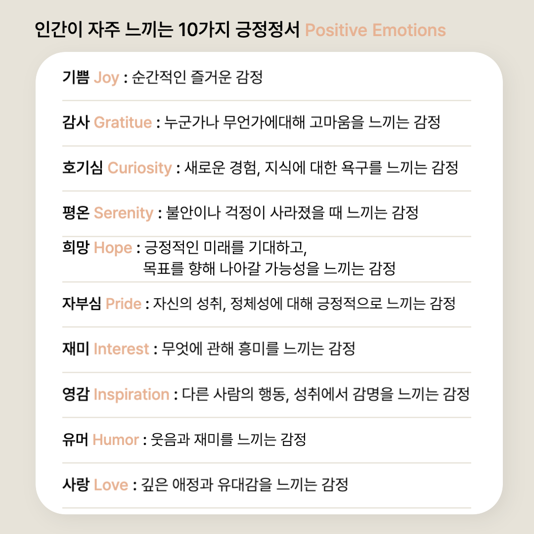 심리학자들은 인간이 자주 느끼는 긍정정서를 10가지로 분류한다. 생각보다 많지 않은가? 각각의 감정을 내가 언제 느끼는지 생각해 보고, 오늘 내 기분을 전환할 수 있는 활동을 시도해보자.