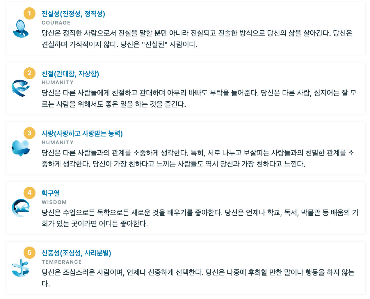 VIA test(https://www.viacharacter.org/)를 통해 test 할 수 있고, 대개 Top 5를 개인의 고유하고도 강한 조합 즉 시그니처 강점(Signature Strength)으로 본다.