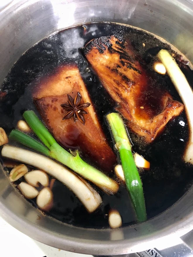 고기 삶는 소스 재료 : 물 2리터, 간장 7T, 노두유 4T(중국 간장인데 색이 진하다. 없으면 일반 진간장으로 대체 가능하나 색이 옅어진다), 마늘 4알, 통후추 1T, 대파 흰 부분 2대, 팔각 2개, 전분물, 참기름 약간.