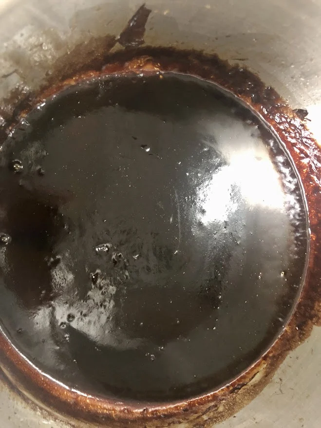 7. 소스 국물이 졸아들도록 조린 후, 고기를 건져내고 소스 중에 건더기를 거른다. 맑은 소스만 남으면 녹말물을 넣어 진득하게 만들고, 참기름으로 마무리한다.