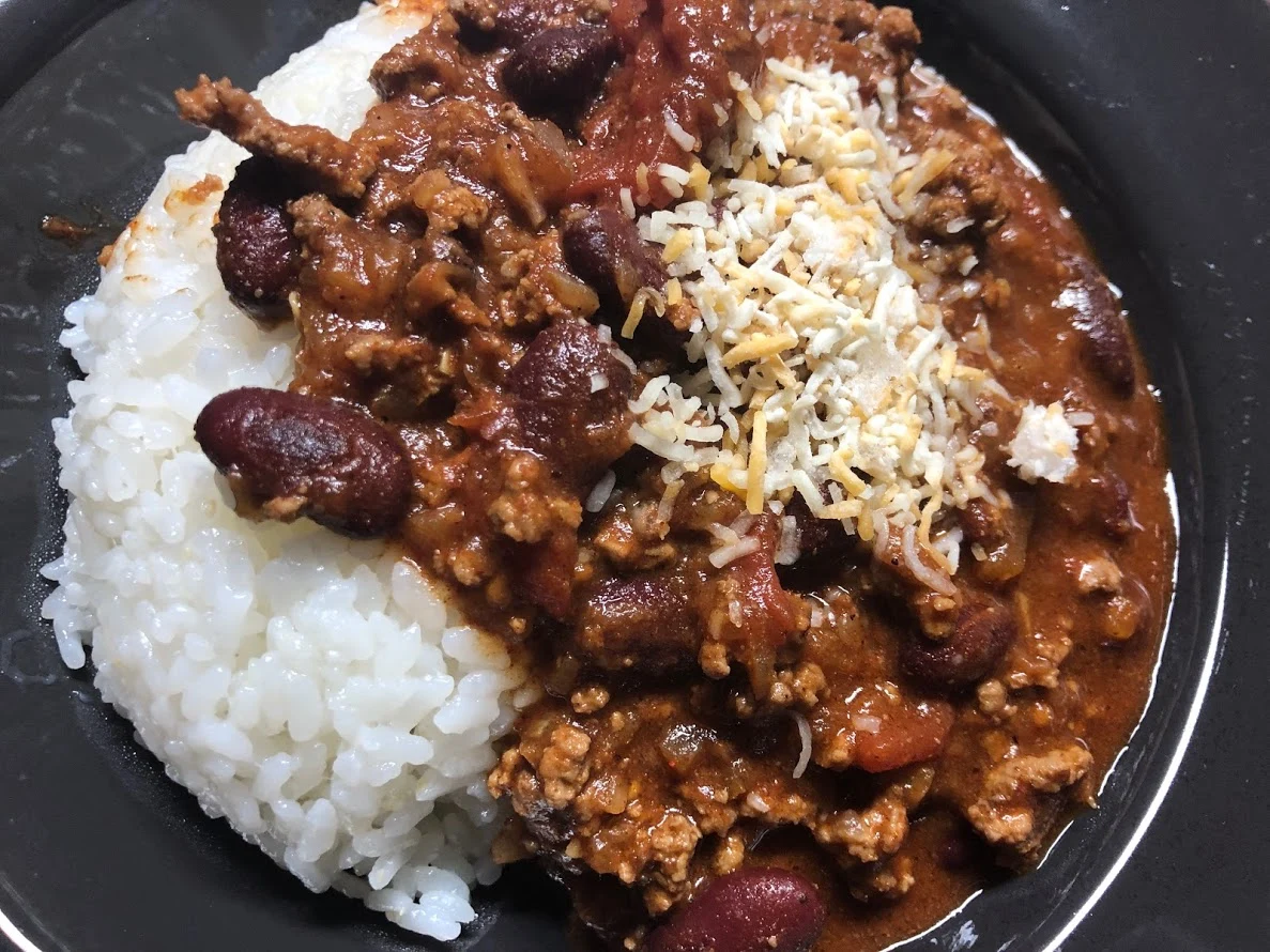 오늘 저녁은 이 미제 선망의 정점에 있는 음식을 해보았다. 저번 하와이 여행에서 사 온 맥코믹 칠리 가루에 소고기를 듬뿍 넣고, 홀토마토와 키드니빈스를 넣어 조리한 후 칠리 라이스를 해 먹었다.