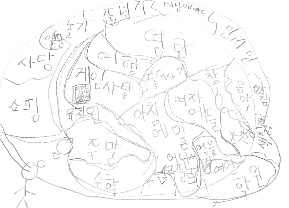 *둘째 아이가 유치원에서 쉬는 시간에 그려온 그림이다. 본인의 뇌에 있는 생각들을 그린 그림인데, 내용이 정말 웃긴다. 아침에 일어나서 소리 질르기, 여자'에'들, 똥 싸기, 먹을 것, 게임...