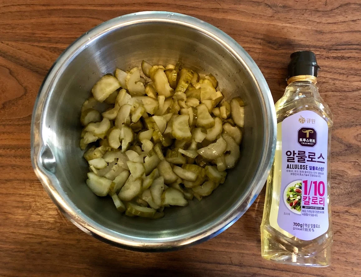 2. 썰어놓은 오이지에 올리고당, 물엿 종류를 넉넉하게 두어 바퀴 휘휘 뿌려 섞어준다. 엄마가 무쳐 준 오이지가 꼬독꼬독 맛있었다면 그건 엄마가 죽을힘을 다해 꽉 짜주셨기 때문이다. 나도 해보다가 너무 힘들어서 삼투압의 힘을 빌린다. 넉넉하게 뿌려도 오이지에서 나온 물과 같이 버리기 때문에 달지 않다.