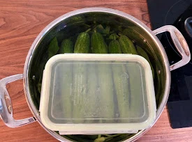 3. 물이 다 끓으면 불에서 내리고, 씻어서 물기를 닦은 오이를 물이 뜨거울 때 곰솥에 바로 투하. 누름돌로 눌러 놓는다. 누름돌이 없으면 그릇으로 눌러 뚜껑을 덮고 무거운 것을 올려 소금물에 오이가 완전히 잠기도록 한다.