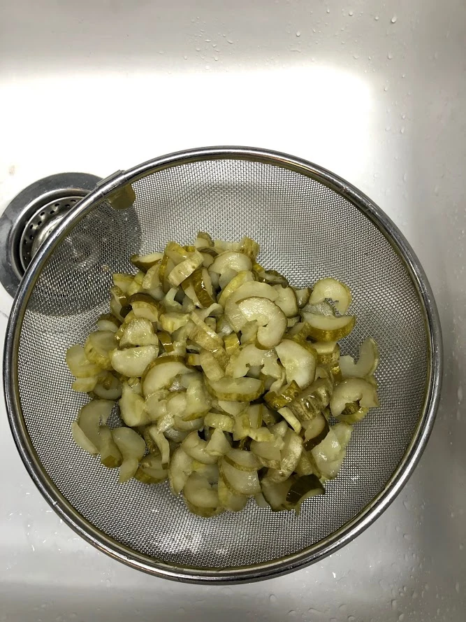 10분 정도 지나 오이지를 채반에 받쳐 손바닥으로 몇 번 꾹꾹 눌러주면 물이 많이 빠진다.