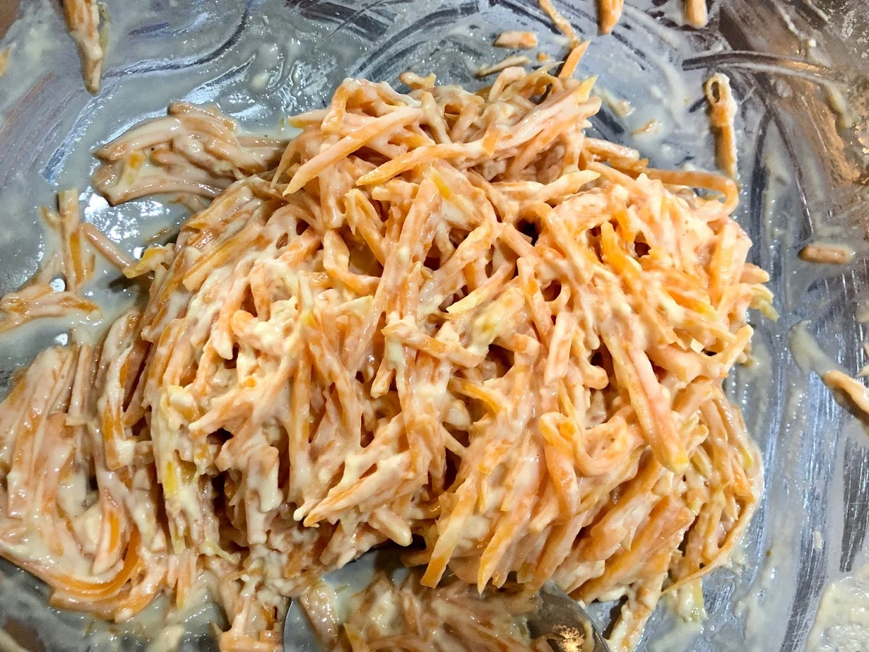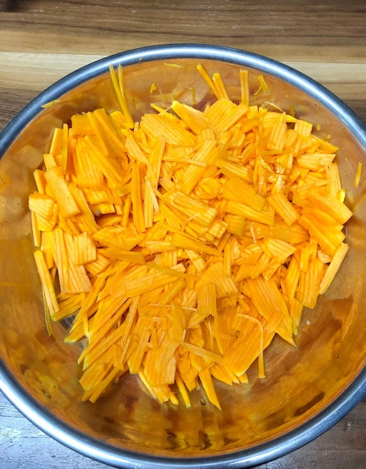 4. 채 썬 호박 색상이 가을 은행잎 같다. 여기에 소금으로 밑간을 한다. 대충 반수저 뿌려 놓고 10분 정도 방치.