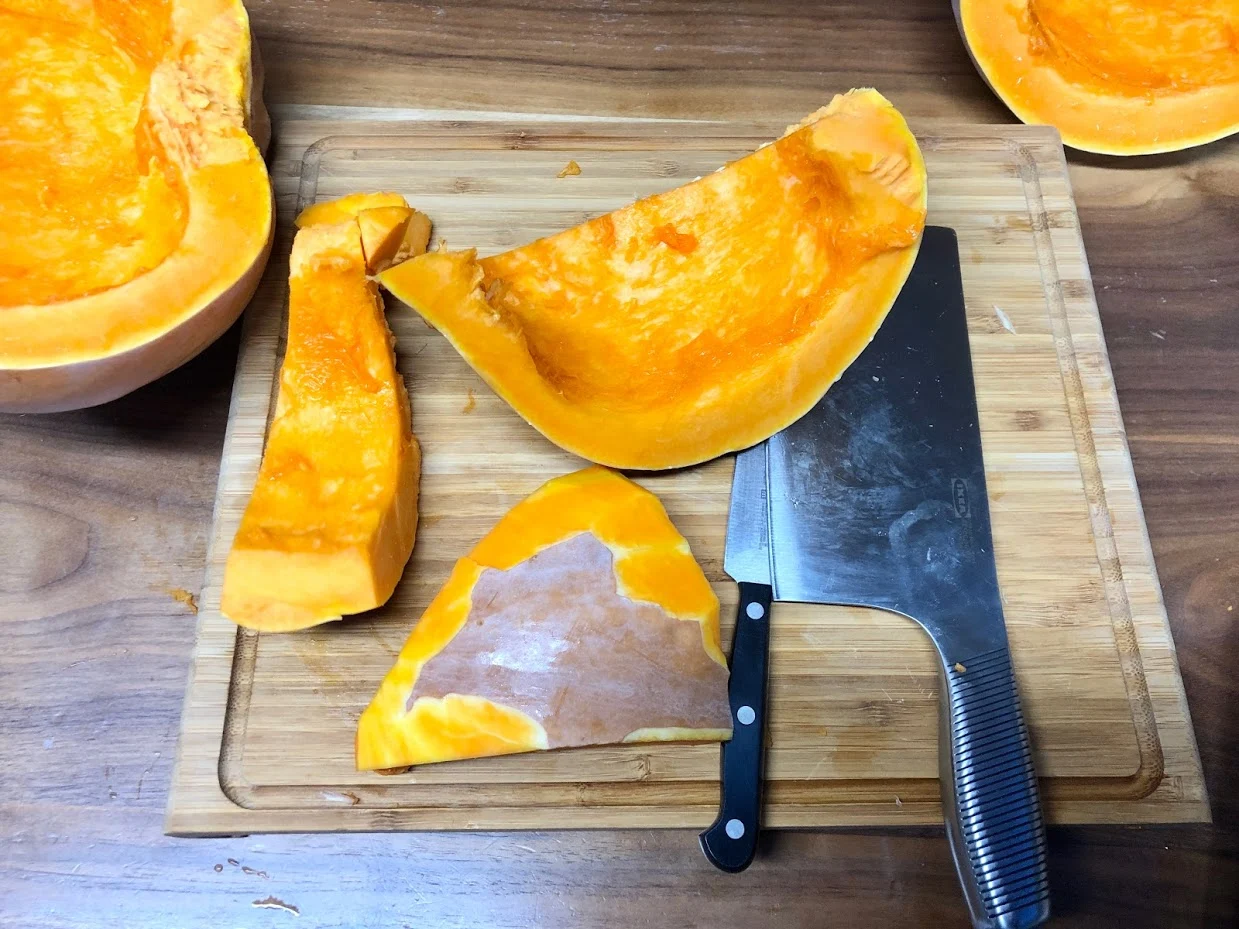 2. 무거운 식도로 자르면 잘 잘라진다. 껍질이 딱딱해서 과도로 벗기다 그냥 중식도로 깎아냈음. 필러로 하는 분들도 있던데 워낙 껍질이 단단해서 그냥 칼로 벗김.