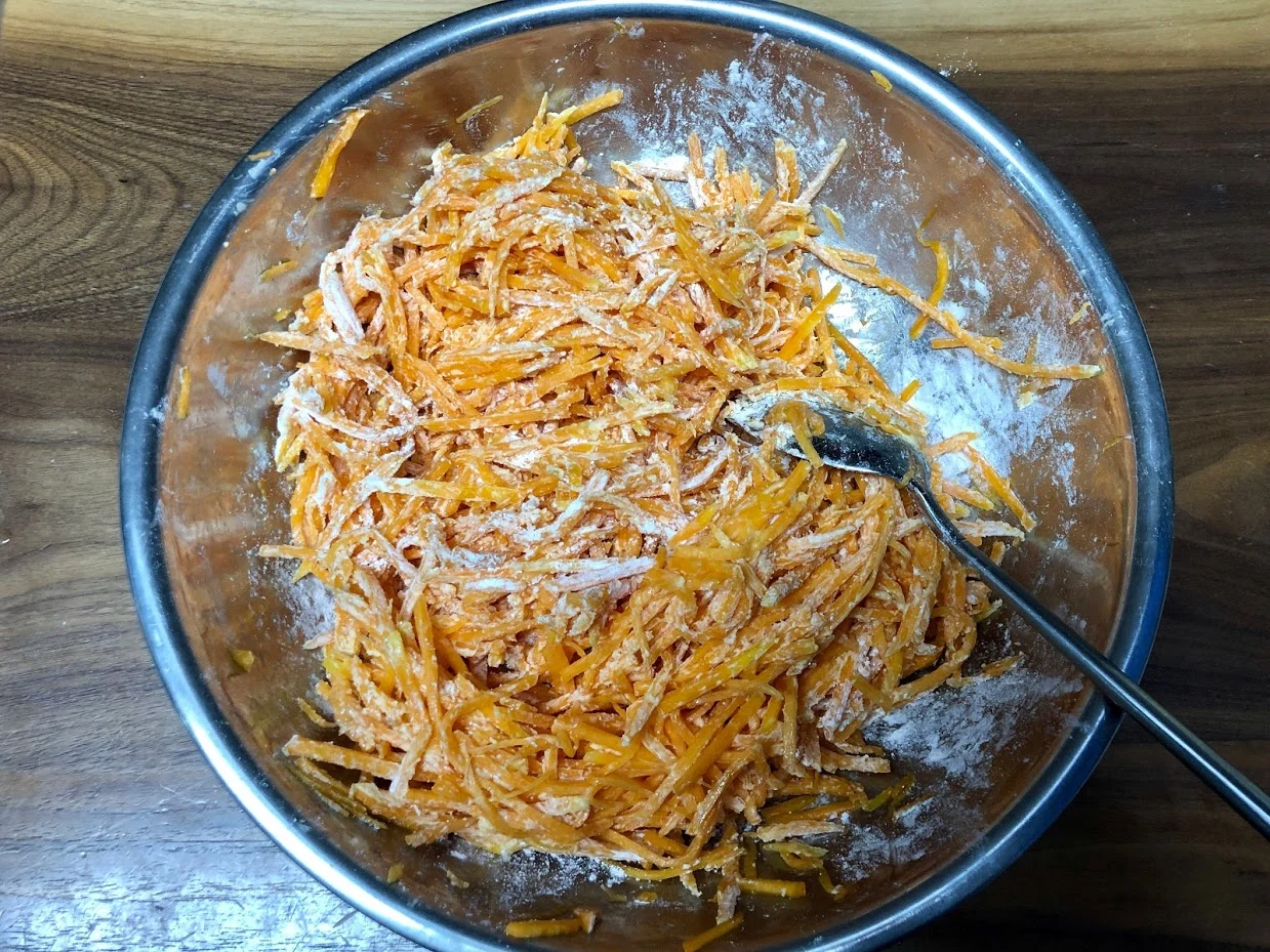 5. 물기가 촉촉이 생기면 버리지 말고 거기에 밀가루와 부침가루를 적당히 섞는다. 물은 붓지 말자.