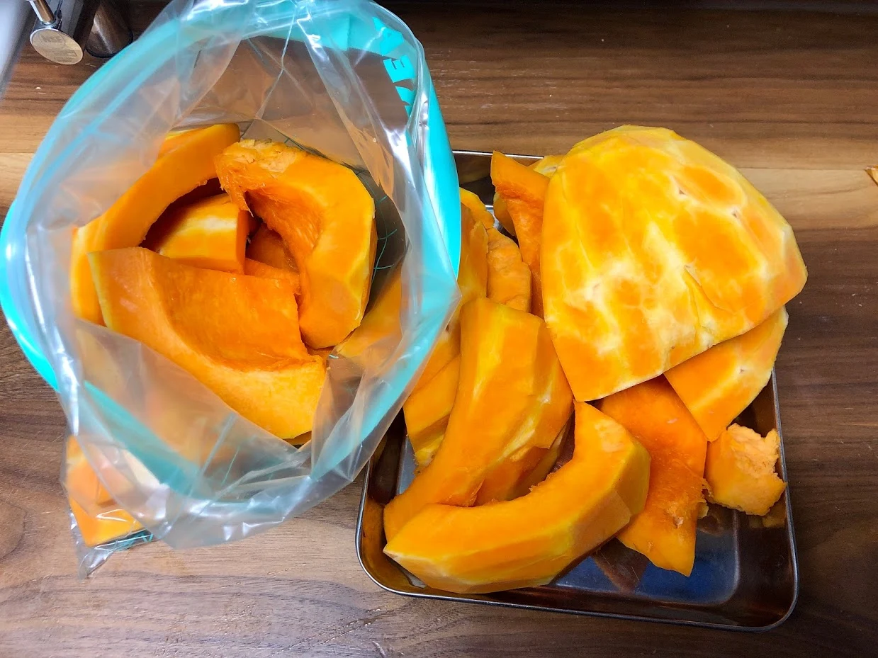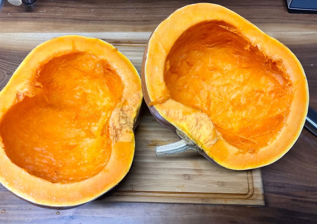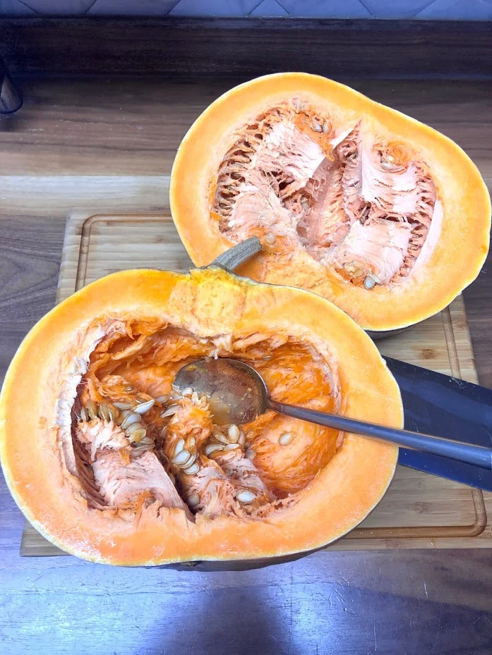 1. 호박을 잘 씻어 반을 가른 후에, 초대형 숟가락으로 긁어낸다. 일반 수저도 가능!