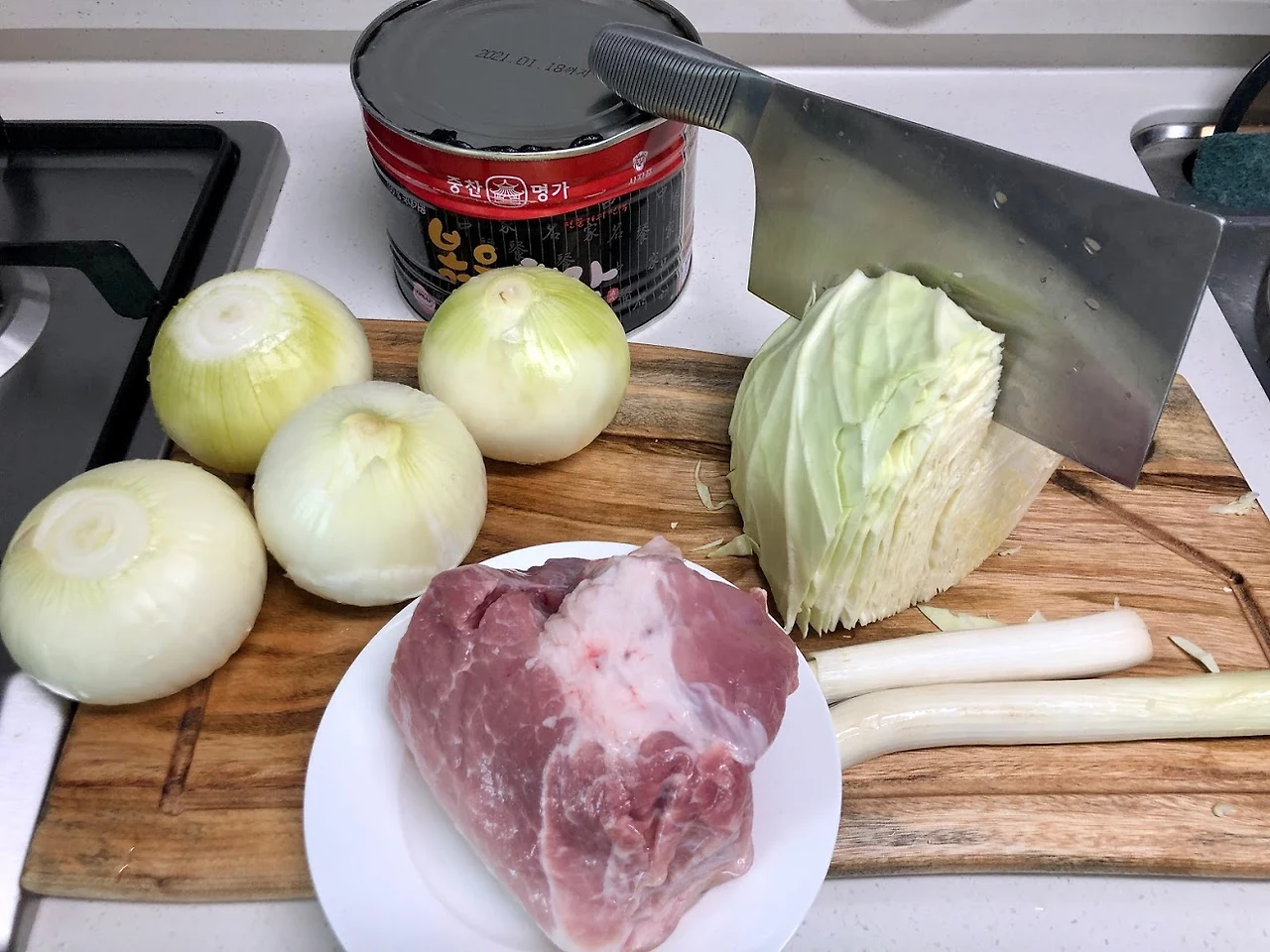 1. 파를 잘게 썬다. 양배추와 양파도 먹기 좋은 크기로 썰어둔다.