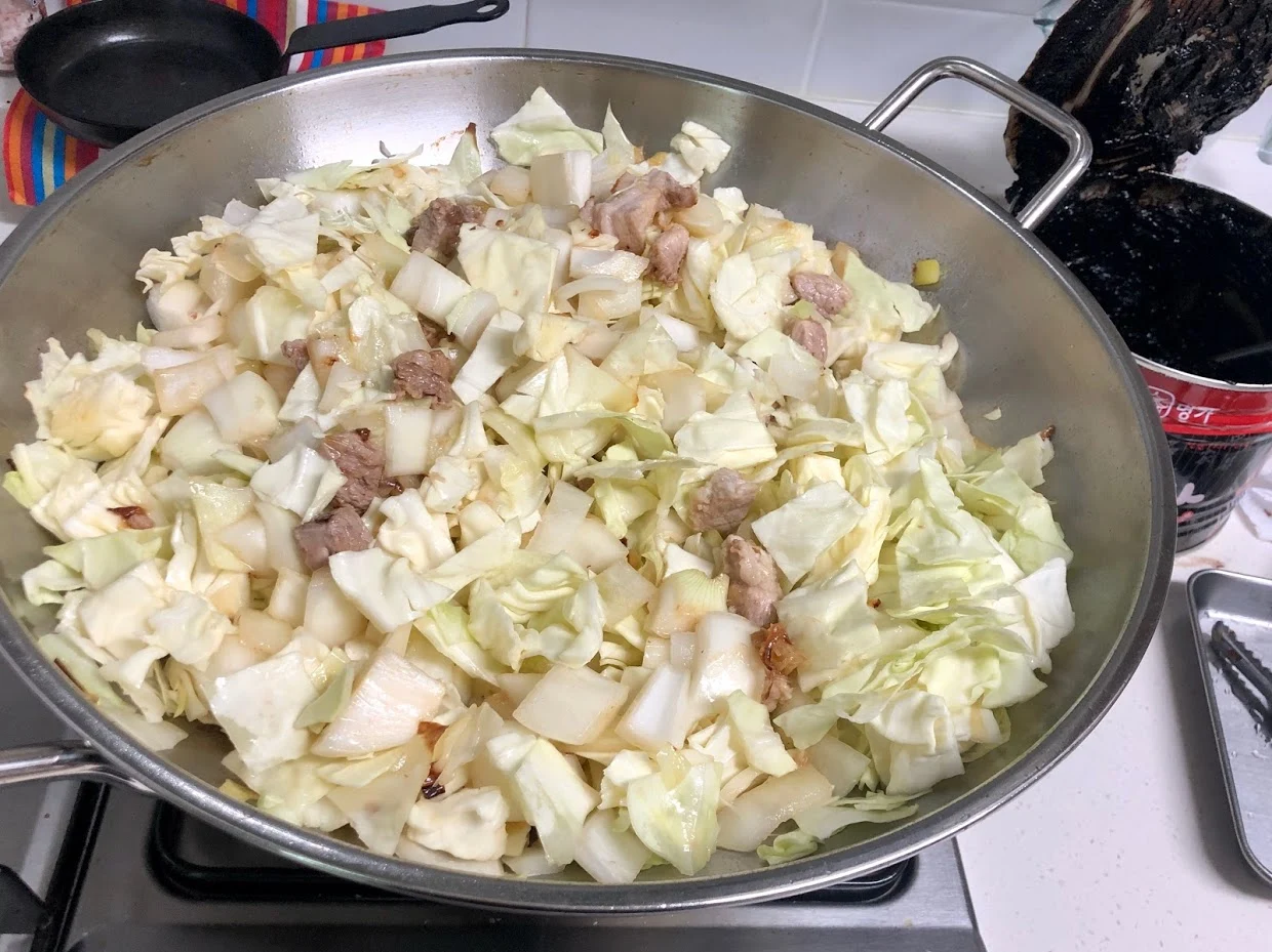 4. 고기를 파 기름에 볶다가 얼추 익으면 양파와 양배추를 센 불에 볶아낸다.