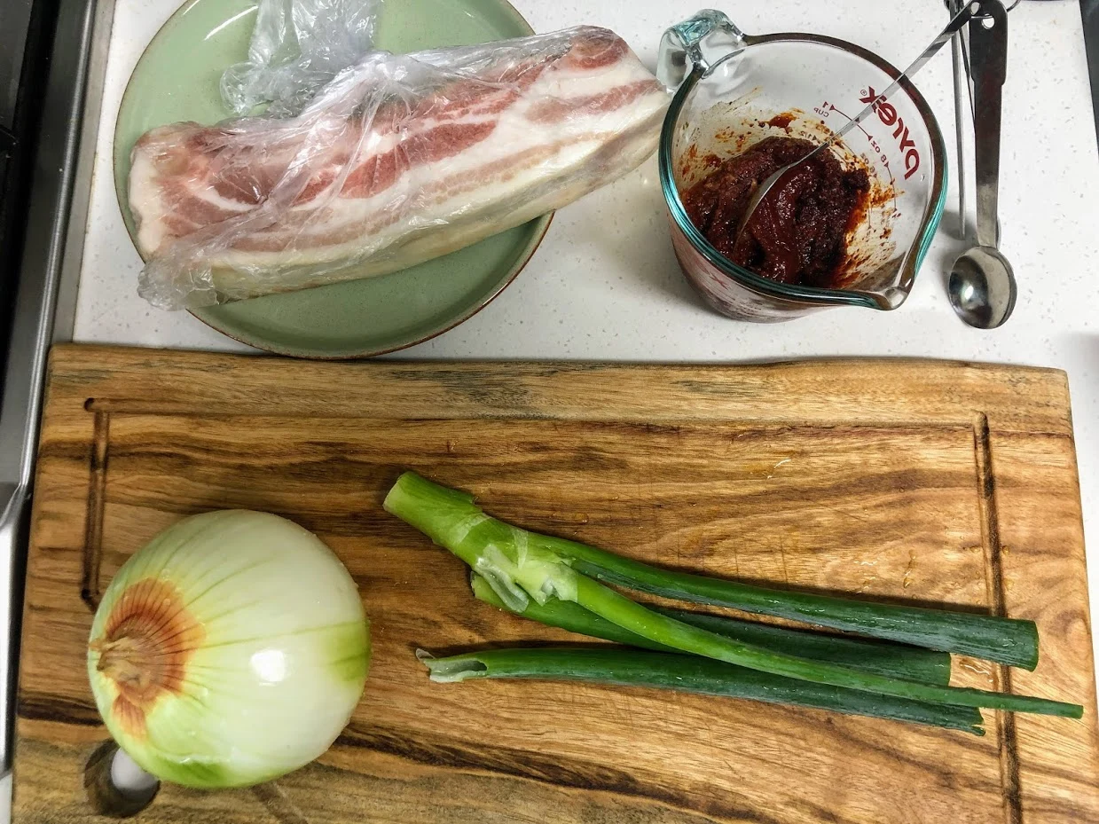 재료 : 돼지고기 500그램(부위는 상관없음. 저렴 버전으로 뒷다리살을 구입하면 단가가 확 내려감. 오늘은 무려 삼겹살로 준비), 양파 1개, 콩나물 한 봉지, 대파 1대