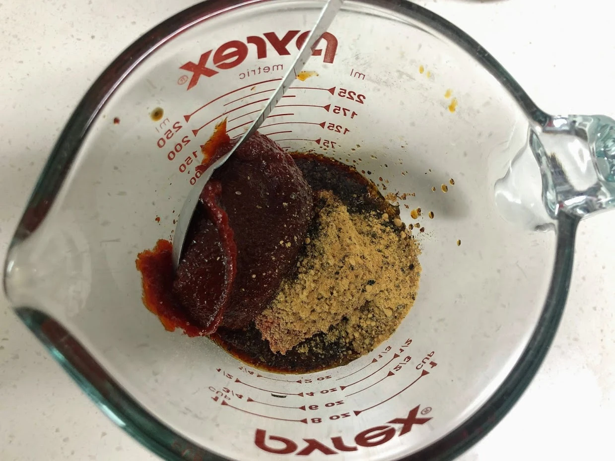 양념 : 고추장 1.5T, 고춧가루 1.5T, 다진 마늘 1T, 국간장 0.5T, 진간장 1T, 설탕 1T, 생강가루 약간, 후춧가루 약간.