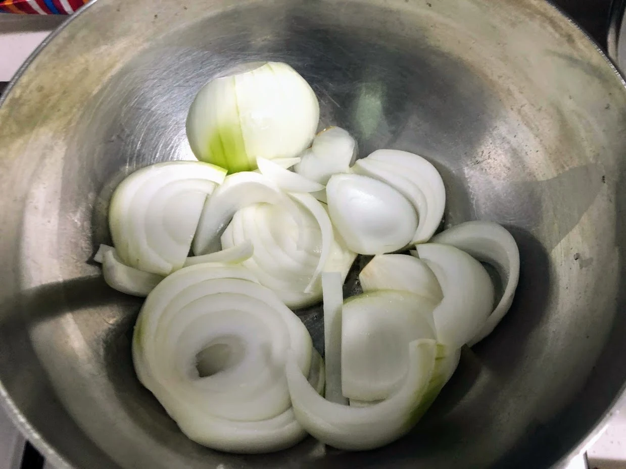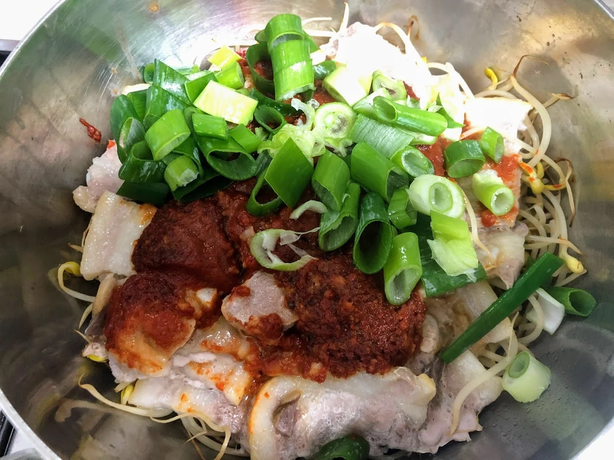 2. 달궈진 웍이나 냄비에 식용유를 두르고 양파, 콩나물, 고기, 양념 순으로 쌓는다.