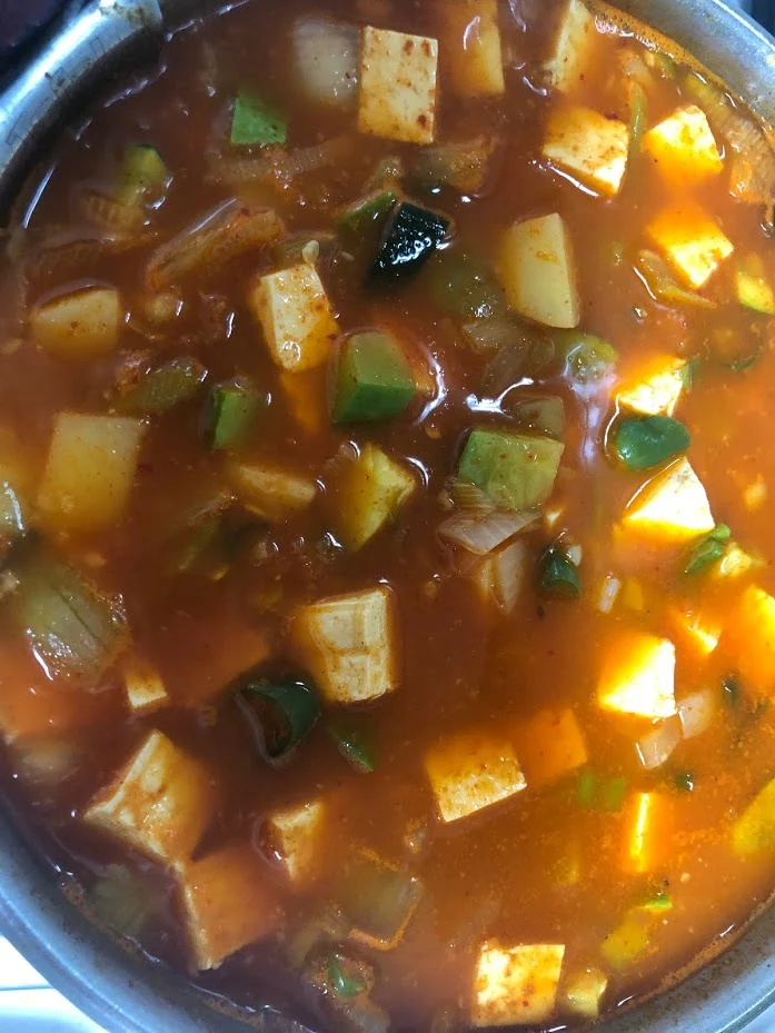 조리법 : 감자 큰 거 한 개, 애호박 반 개, 양파 한 개, 두부 한 모는 깍둑 썰고, 대파 한 대, 청양고추 3개는 다진다. 냄비에 기름을 넉넉히 두르고 다진 마늘 한 스푼 넣고 볶다 감자를 넣고 볶는다. 고추장 2큰술, 참치액과 국간장을 1큰술 씩 넣고 잘 뒤섞어 준다. 원래는 멸치육수 700ml를 넣어야 하나 맹물을 붓고 참치액을 한 스푼 더 넣고 맛소금으로 간을 했다. 20분 정도 바글바글 끓인다.