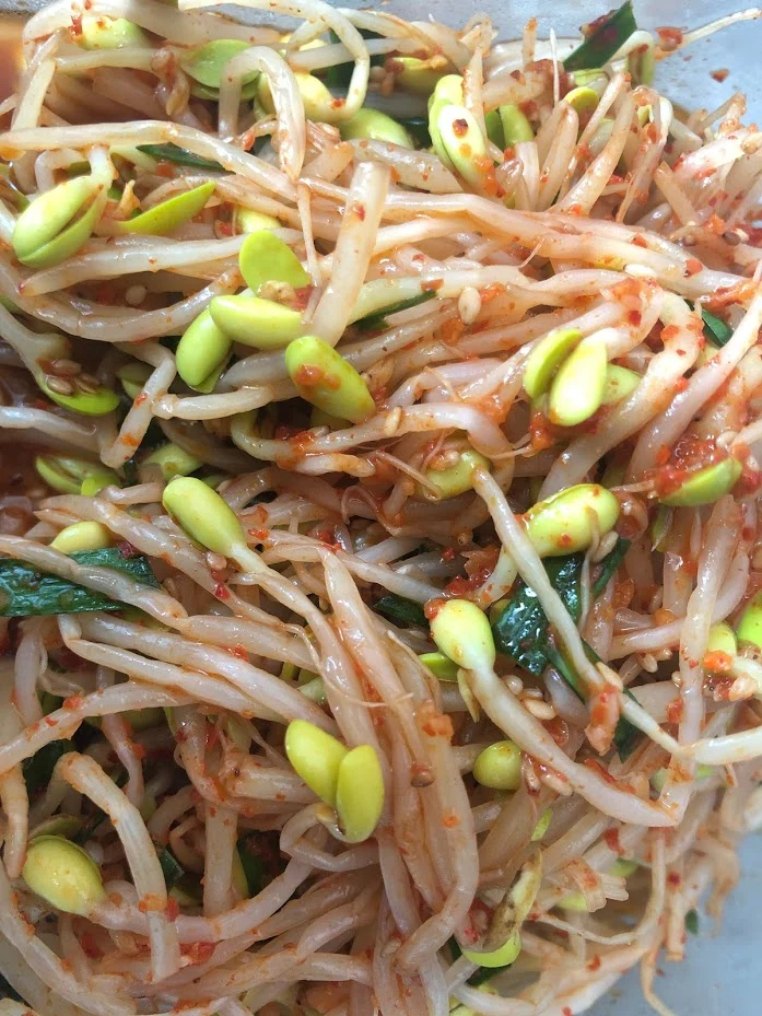 조리법 : 콩나물 살짝 삶아 찬물에 헹구고 고춧가루, 멸치액젓 약간, 다진 마늘, 맛소금, 참기름 넣고 조물조물. 대파, 쪽파, 부추 중에 있는 것 조금 넣고 마지막에 통깨 약간!