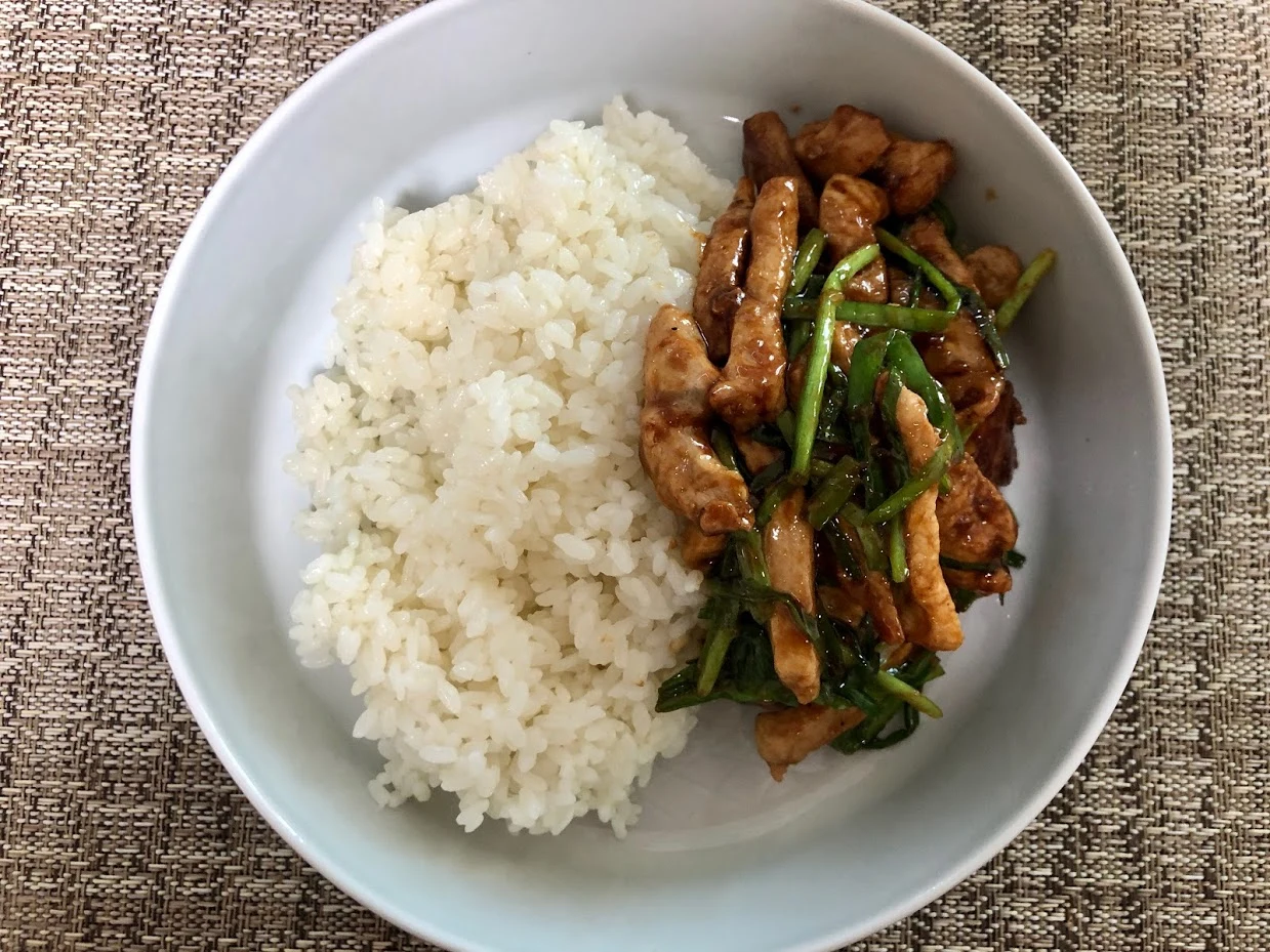 며칠 전 돼지고기를 손질하고 있는 걸 본 아이가 부추랑 굴소스에 볶아서 밥에 얹어 달란다.