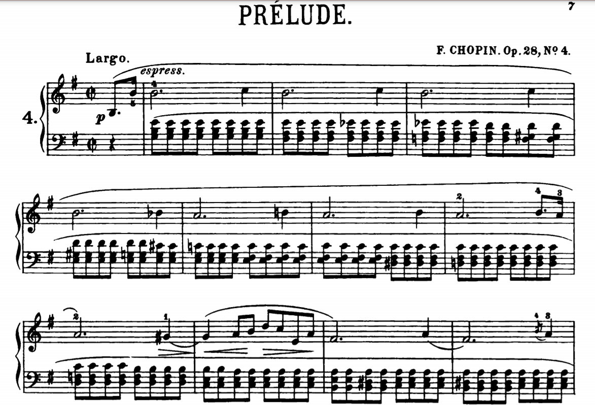 다음 악보는 내가 학생일 때 곡을 쓰면서 항상 참고하고, 대학 입시생들에게도 항상 필수로 분석하게 한 쇼팽의 프렐류드이다. 이 곡의 멜로디는 굉장히 단순한데 반주의 화성 진행이 아주 훌륭하다. 왼손 화음 중에 한 두음이 하향 진행하며 변화하는 느낌을 최소화 하지만 한 마디 안에 화성이 세 번 변하는 곳도 많이 있다. 듣는 사람은 전혀 알아챌 수 없을 만큼 편안하다. 굉장히 세련되게 표현한 복잡한 구조의 음악인데 듣는 사람은 아주 평화롭다.