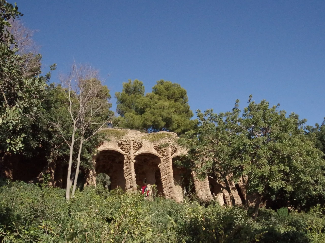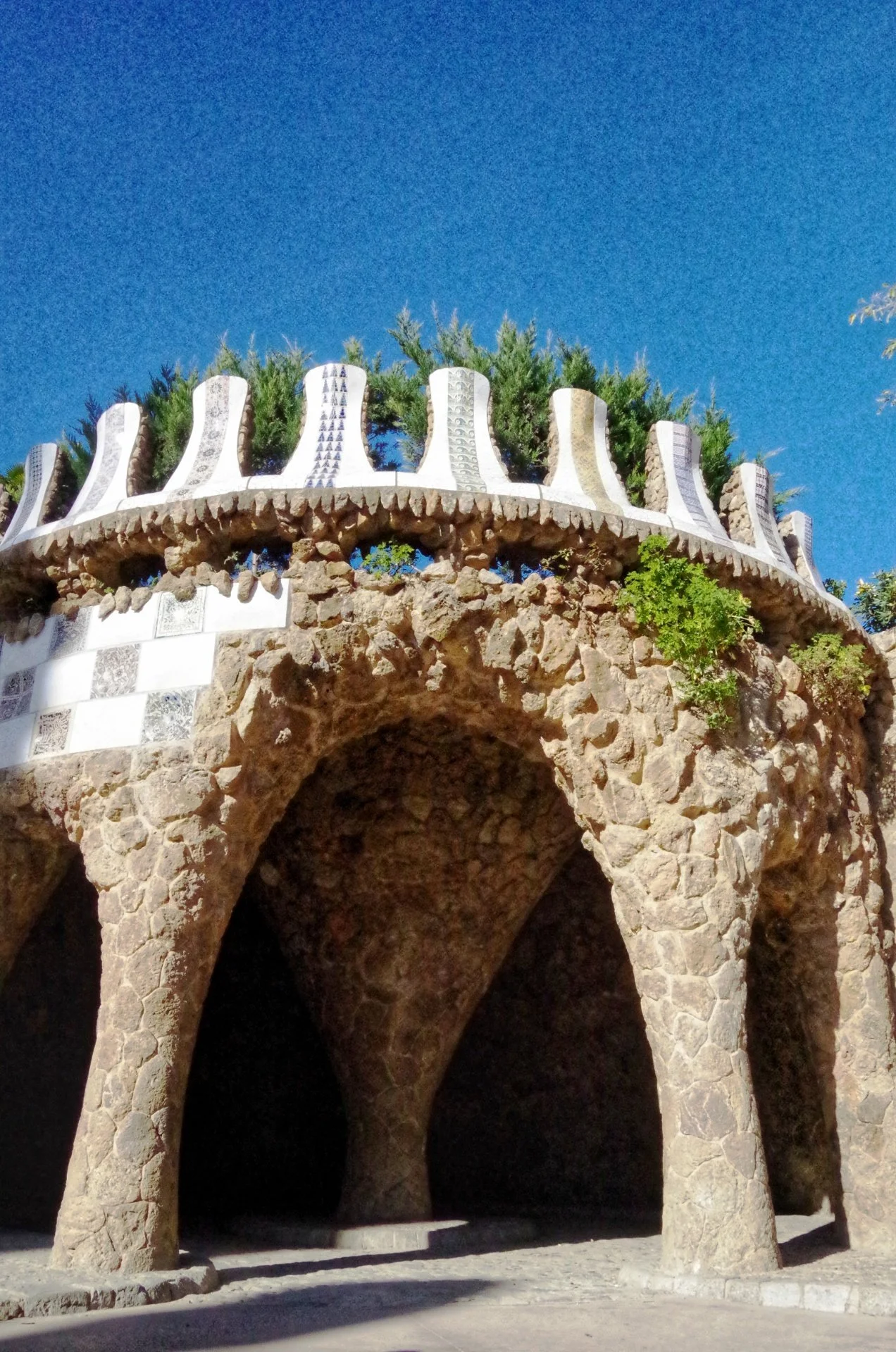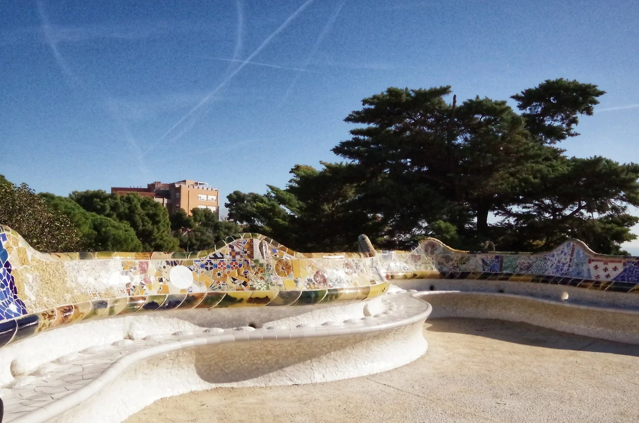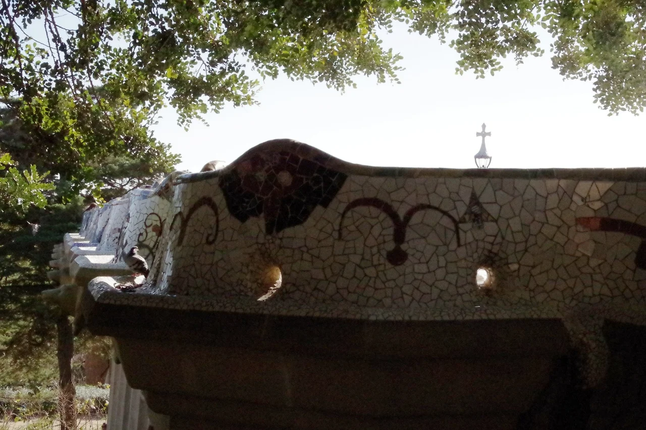 흙을 파내 아치 구조를 만들고 아치의 천장 위에 파낸 흙을 얹어 구조물을 완성해 아치 산책길(프롬네이드)이 탄생한다. 복잡한 형태를 조각조각 해체하고 다시 조립 가능하게 조울해 만들어 낸 이 건물들은 현대 공법을 1세기나 앞지른 시도를 하고 있었던 것이다. 대지의 구획정리를 끝내고 다양한 수목과 자생식물들을 심어 원래의 숲을 복구해 자연미를 살리고 신화와 전설 속 이야기들이 숨 쉬는 공간으로 이곳을 만들어낸다. 각종 타일 원반장식과 지하수의 수호신인 퓨톤이 지금 막 솟아 나온 물줄기처럼 장식되어 빛나고 바르셀로나의 부흥과 재건을 꿈꾸던 구엘의 마음을 응원하는 86개의 원기 등으로 지어진 신전의 보드란 곡선은 저절로 경탄을 자아낸다. 신전의 기둥이 떠받치고 있는 옥상으로 올라가면 바르셀로나의 태양에 온전히 몸을 맡기고 눈을 감은채 벤치에 기대어 있는 이들의 여유로운 표정과 미소들을 만나는 공간이 나온다.