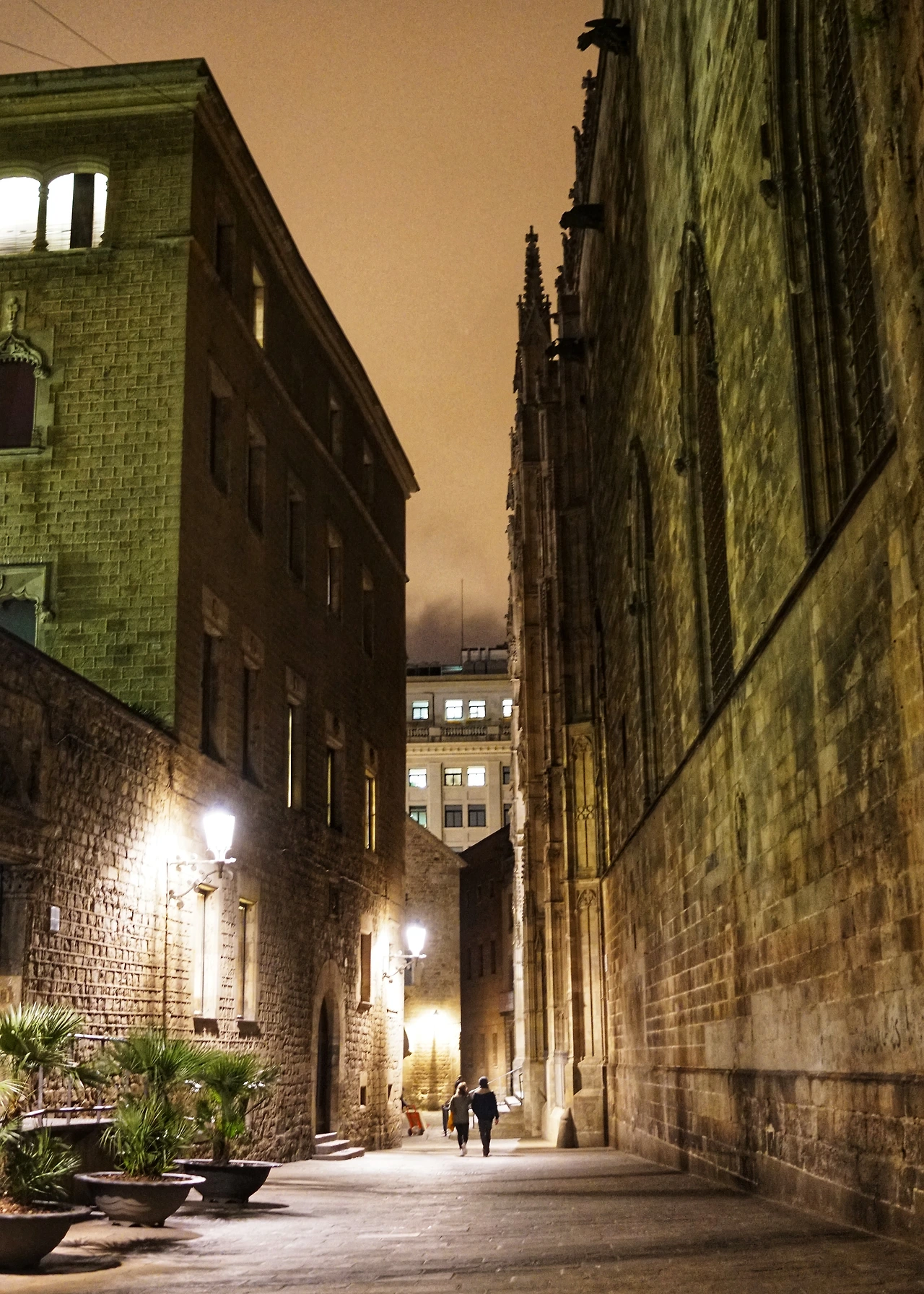 밤이 깊어지자 도시는 불빛에 잠겨든다. 저녁을 먹은 우리는 바르셀로나 대성당과 음악당 등의 건물들을 보고 싶어 거리로 나온다. 황금빛으로 물든 거리는 분주히 오가는 차들과 사람들 사이 잠들지 않는 영혼들을 위한 품을 내어주고 있다. 람블라스 거리의 가우디의 애환을 담은 철재 주조 가로등은 은은하게 빛나고 있다. 석양이 물든 거리를 걷던 가우디의 족적이 눈앞에 새겨진다.