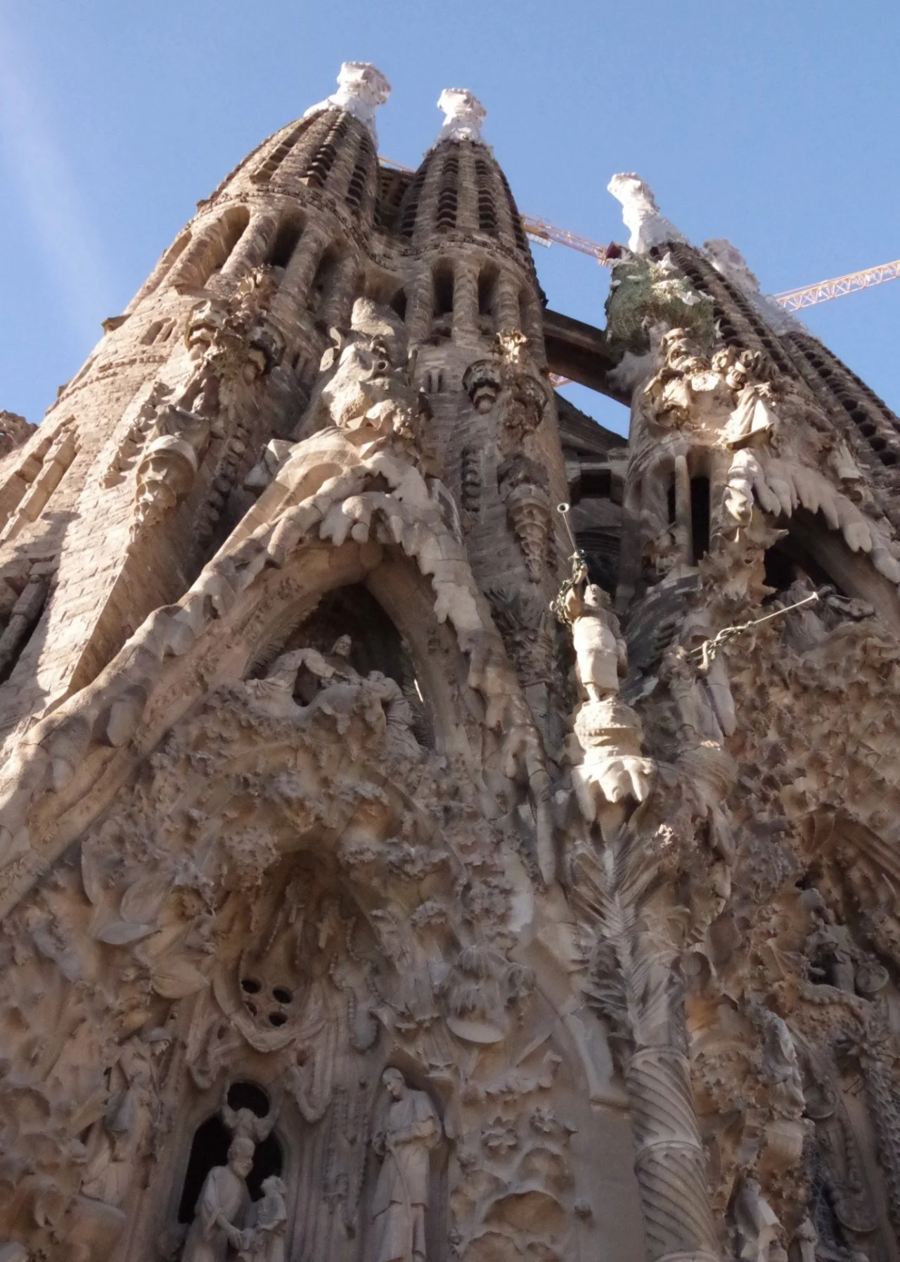 프로벤시아 거리의 표지석 같은 첨탑, 서쪽 수난의 파사드에서 시계 방향으로 한 바퀴 돌면서 전체 규모를 바라보며 노자의 도덕경 구절이 첨탑을 따라 물결이 되어 내게 흘러오는 느낌에 발길을 계속 멈추게 되었다. 그가 남긴 유산이 곧 완결이 될 거란 기대감과 더불어 이미 완성된 작품은 죽은 것이나 다름없다는 피카소의 말을 완벽히 뒤엎을 순간을 그리다 보면 숨이 가빠진다. 생전 완성한 공간은 탄생의 파사드 제일 좌측 첨탑 하나에 불과하다.