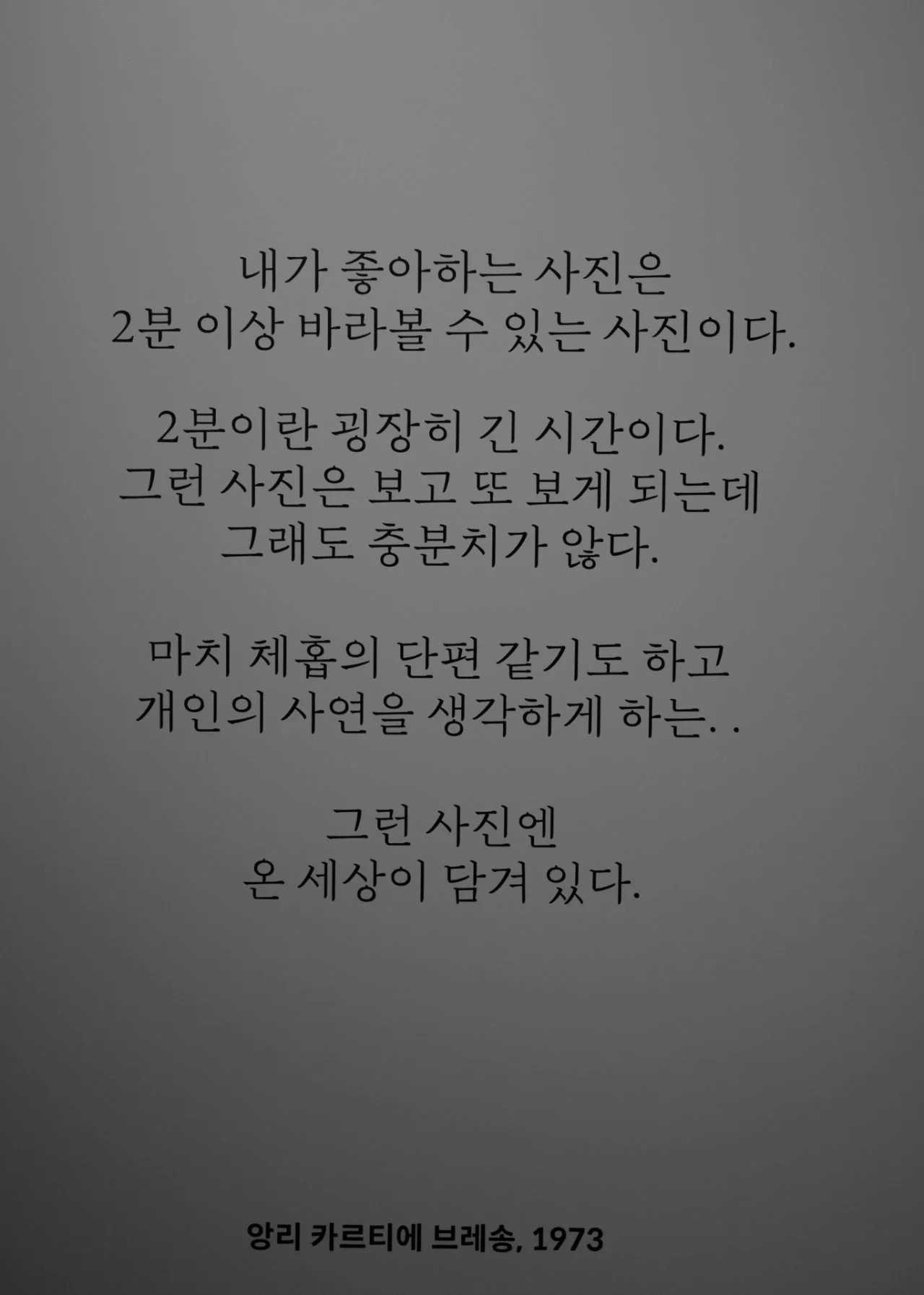 나에게 사진은 순간과 순간의 영원성을 포착하는, 늘 세심한 눈으로부터 오는 자연스러운 충동이다. 드로잉은 우리의 의식이 순간적으로 파악하는 것을 섬세한 필적으로 구현해 낸다. 사진은, 성찰을 드로잉 하는 순간적인 행위이다." - 1992. 4. 47