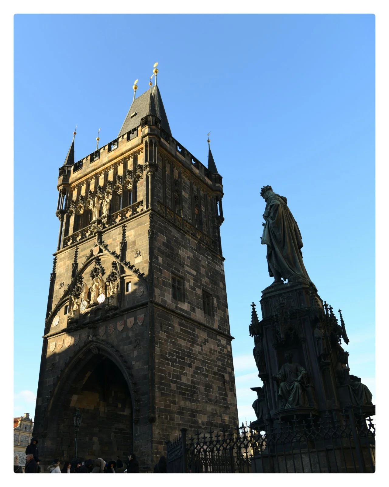 여행에서 경험하는 제일 설레는 점은 낯선 향이 풍기는 새로운 음식들을 만나는 일이지 않을까? 고소한 빵의 온기와 추가로 주문한 수프의 향에 끌려 필스너우르켈도 한잔 마셨겠다, 화장실 다녀왔겠다(유럽여행에서 가장 큰 공포는 우리나라처럼 즐비한 화장실을 찾을 수가 없다는 점. 모든 동선 위에 화장실 파악은 늘 필수!) 든든해진 난 카를교로 향했다. 골목과 골목을 더듬어 걷는 일은 온 신경이 날카로워지는 일이기도 하다. 구글맵에만 의존해서 길을 잃을까 노심초사하며 헨젤과 그레텔을 위해 던져둔 빵부스러기(?) 같은 지번이 적힌 팻말에 시선을 두던 난, 드디어 카를교의 화약탑을 본다. 뾰족한 첨탑의 거뭇한 건물, 그 뒤에 자리한 600살의 돌다리가 나를 반긴다. 튼튼하게 만들기 위해 사암에 계란 노른자를 섞었다는 노란빛의 다리.
